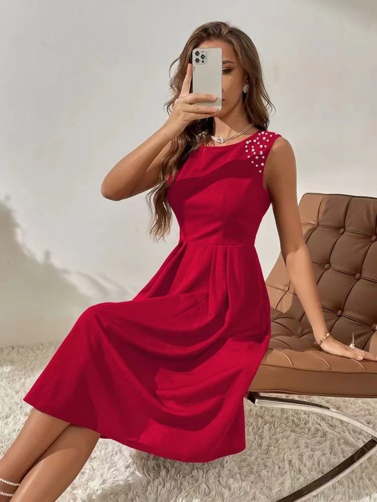 2023 nowa damska dopasowana sukienka bez rękawów z okrągłym dekoltem i koralikami