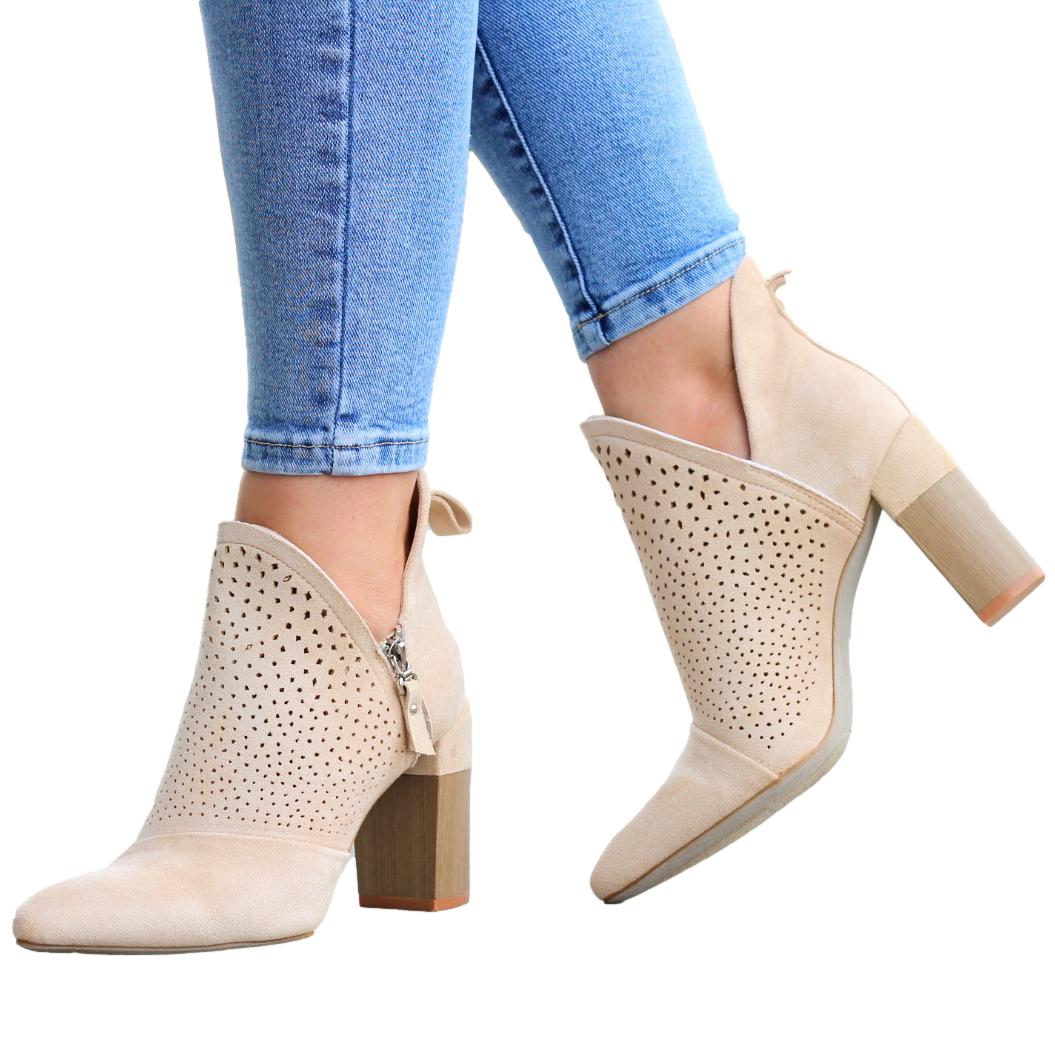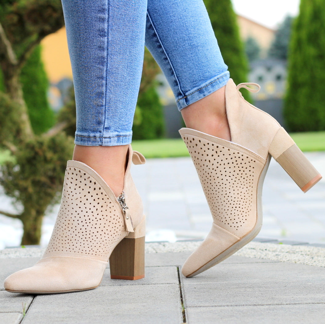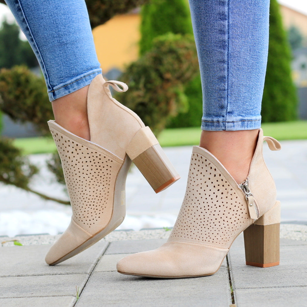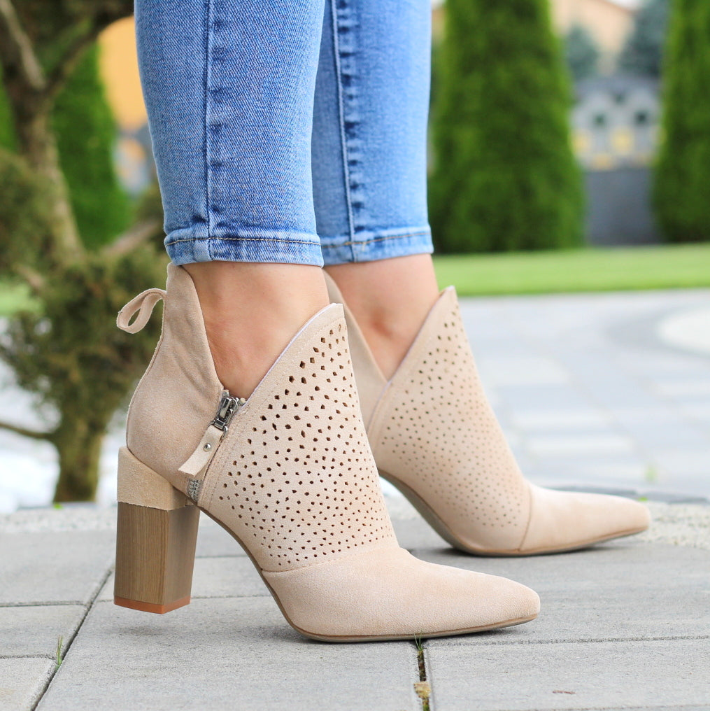 BEŻOWE DAMSKIE BOTKI ZAMSZOWE Z WYCIĘCIEM NA SŁUPKU