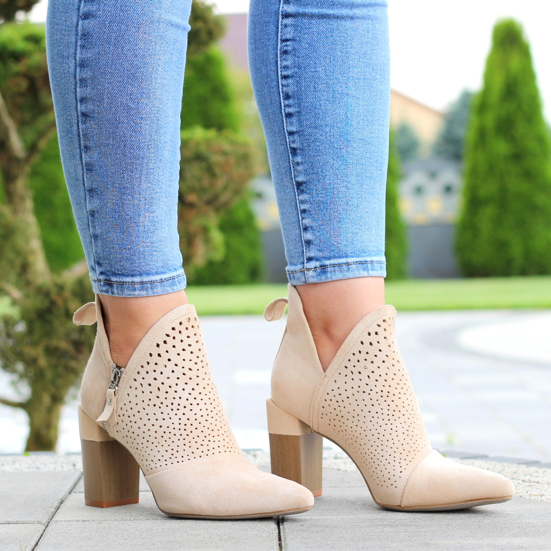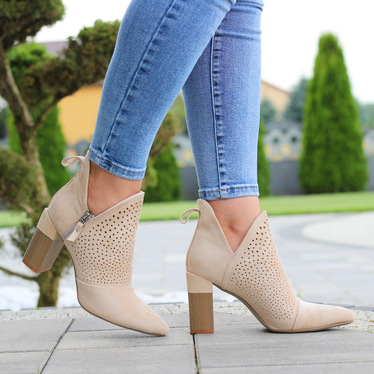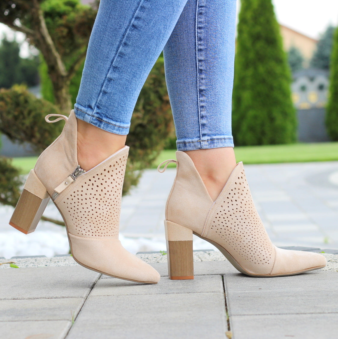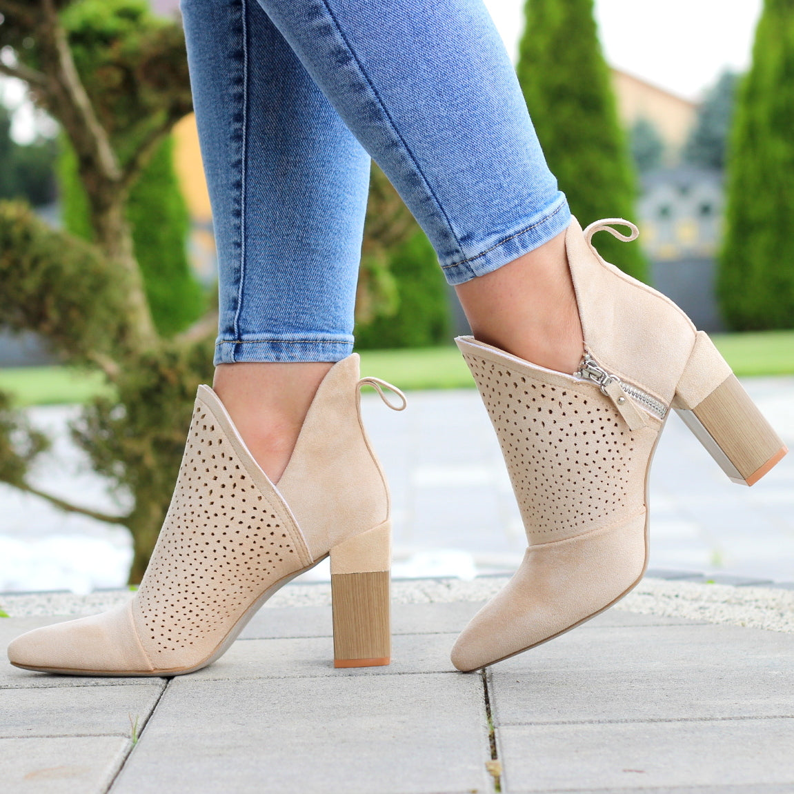 BEŻOWE DAMSKIE BOTKI ZAMSZOWE Z WYCIĘCIEM NA SŁUPKU