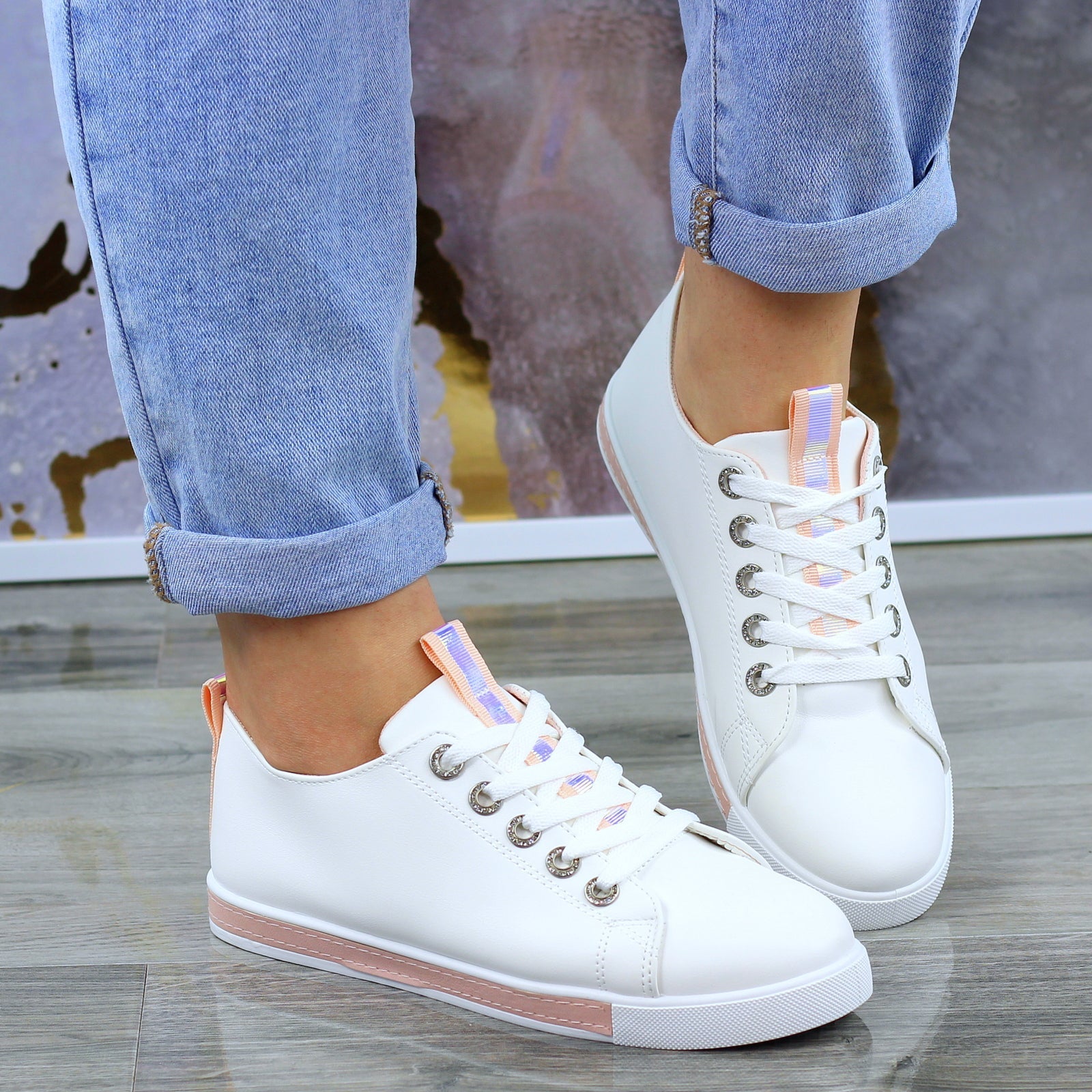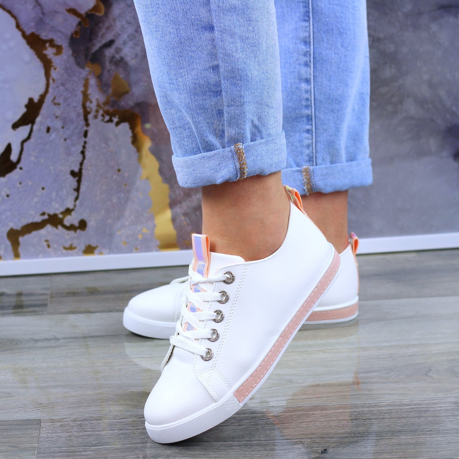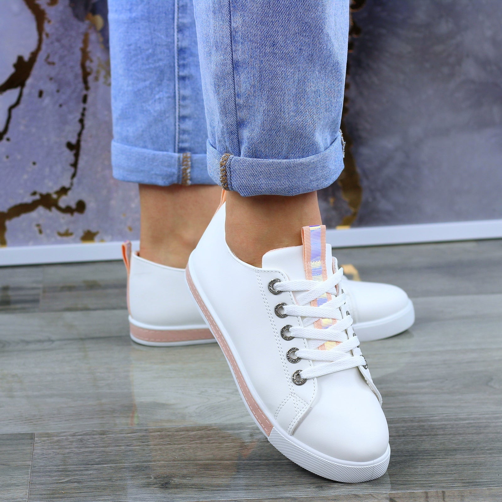 MODNE BIAŁO BRZOSKWINIOWE SKÓRZANE TRAMPKI DAMSKIE SZNUROWANE