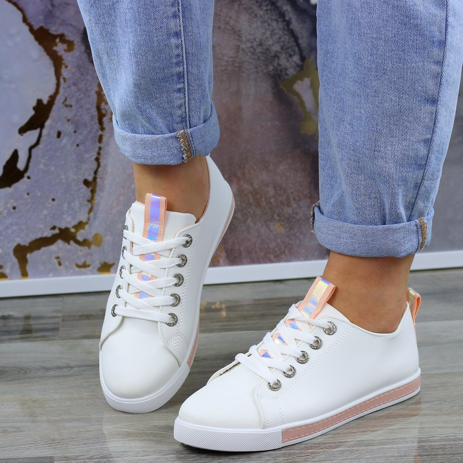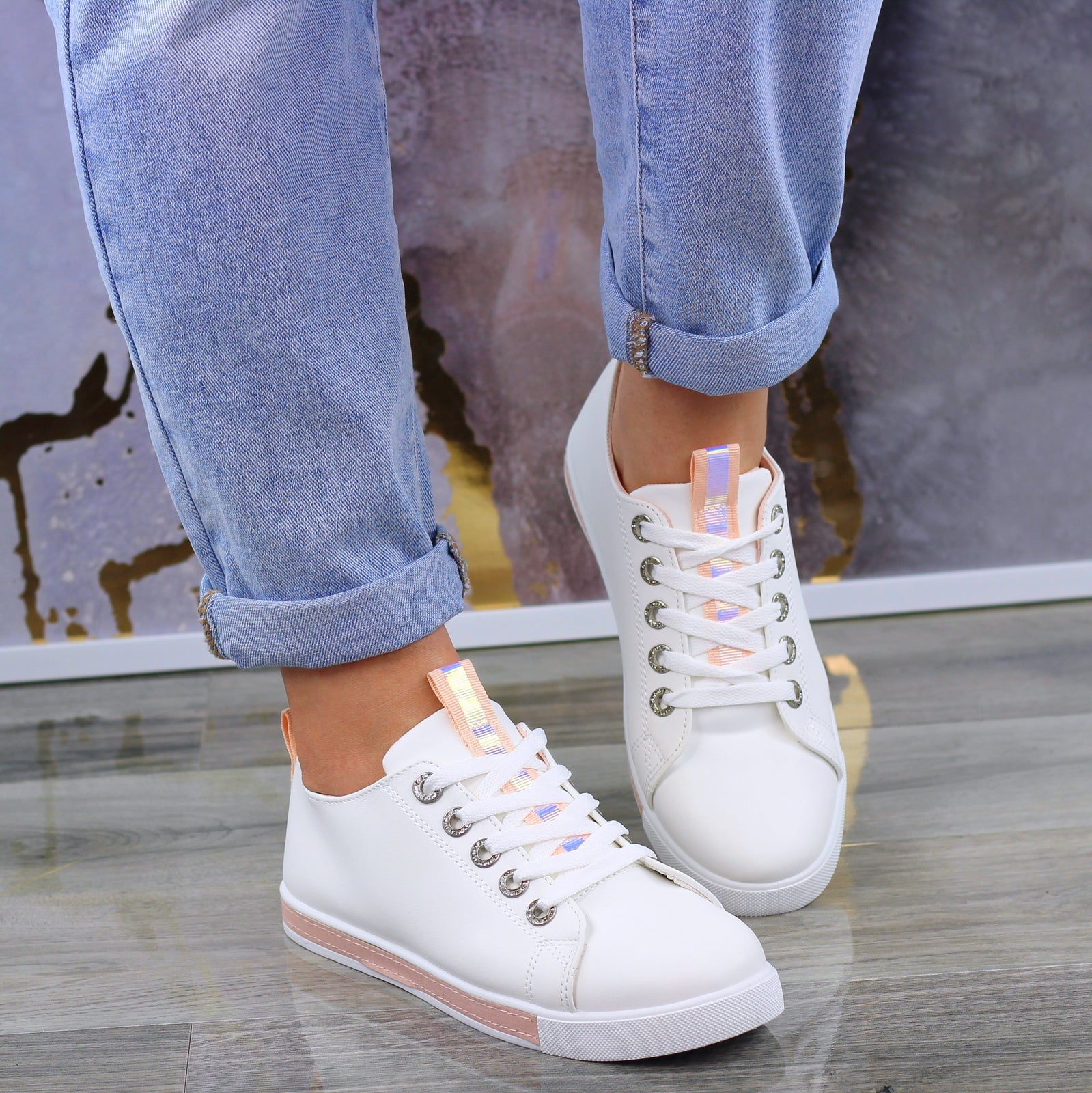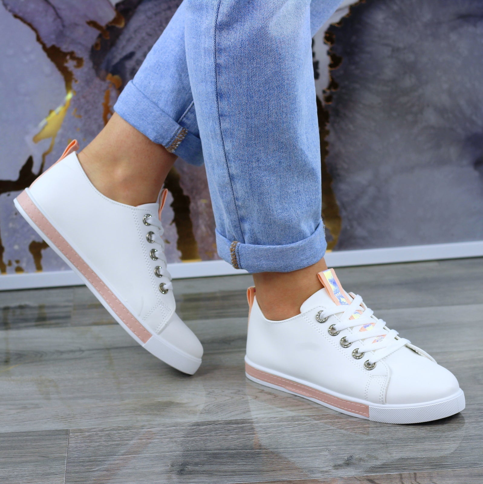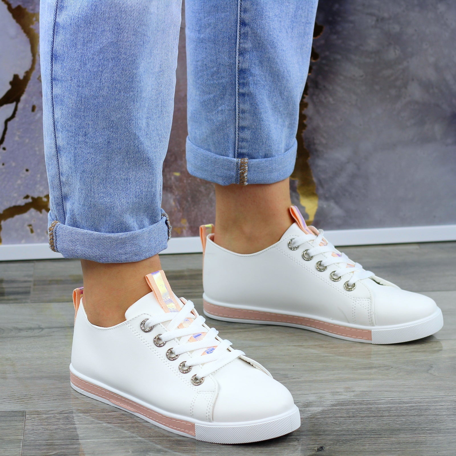 MODNE BIAŁO BRZOSKWINIOWE SKÓRZANE TRAMPKI DAMSKIE SZNUROWANE