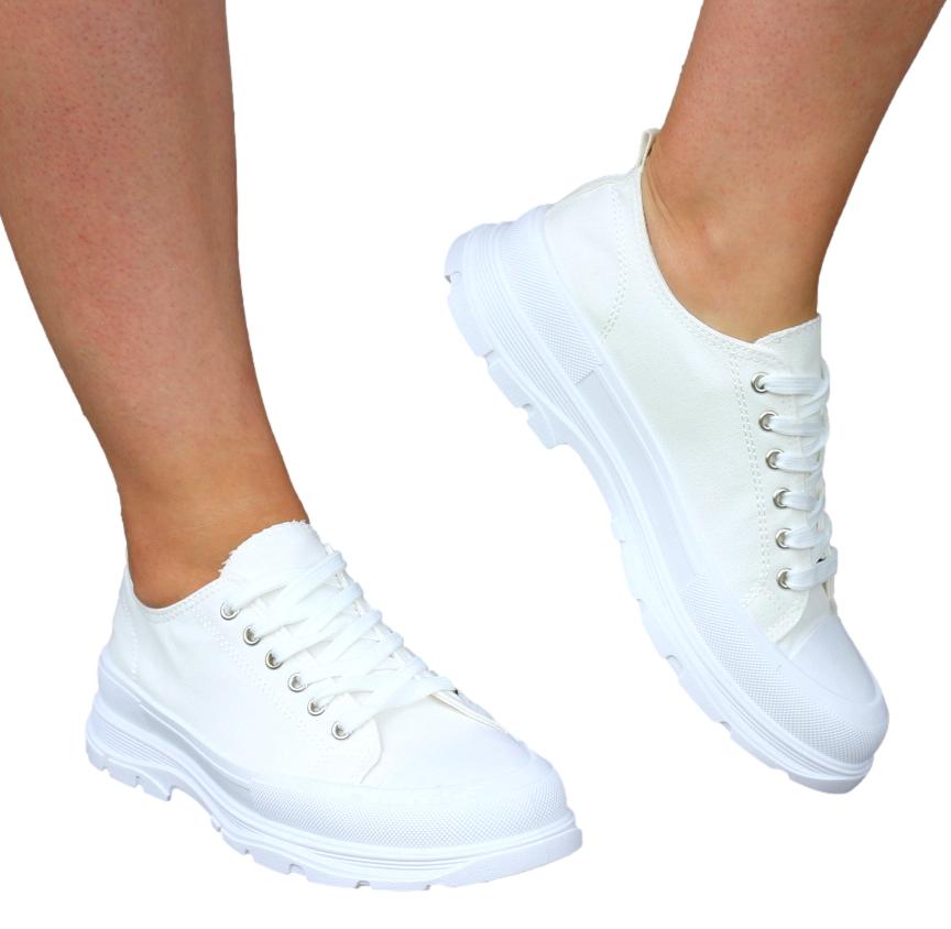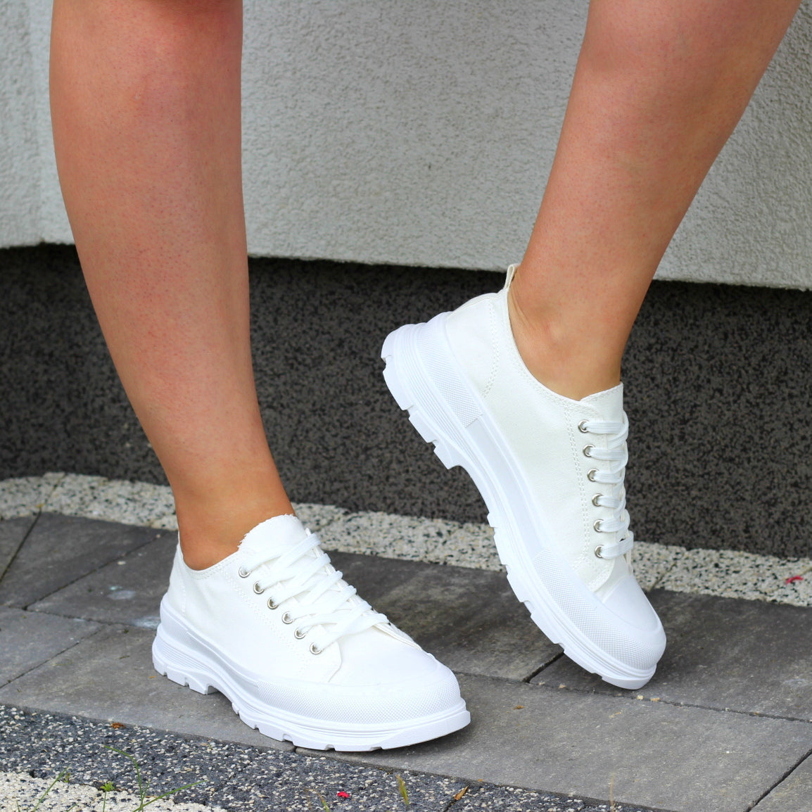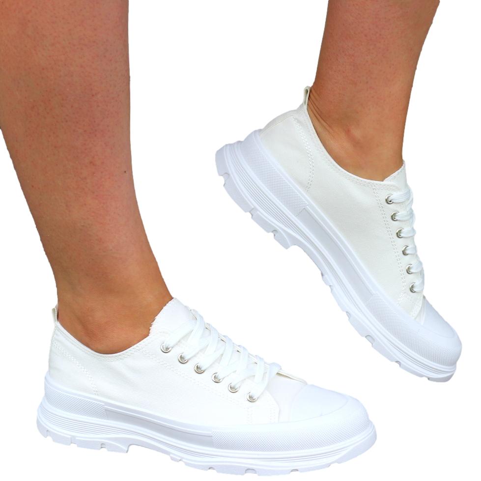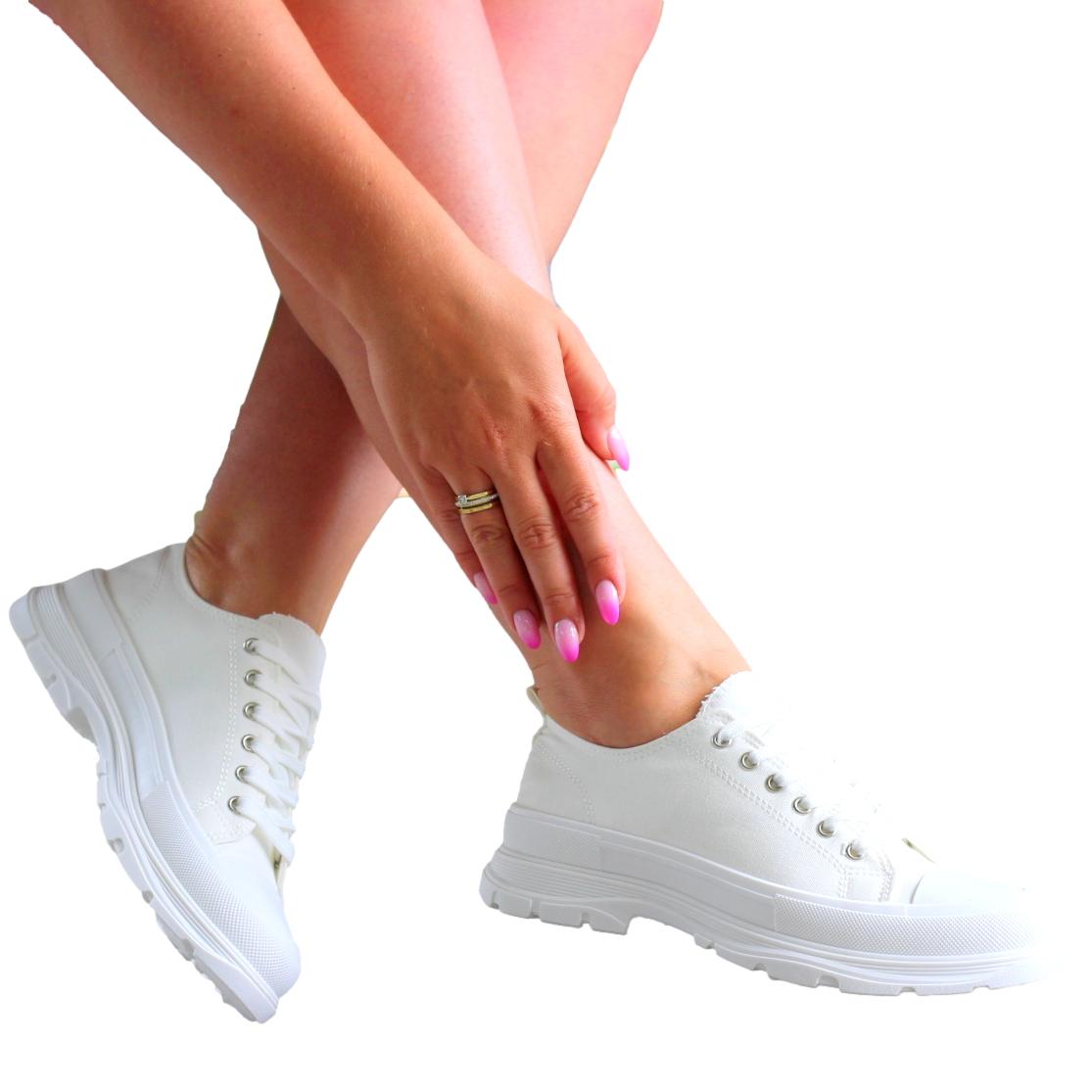 BIAŁE MATERIAŁOWE TRAMPKI DAMSKIE NA GRUBEJ PODESZWIE