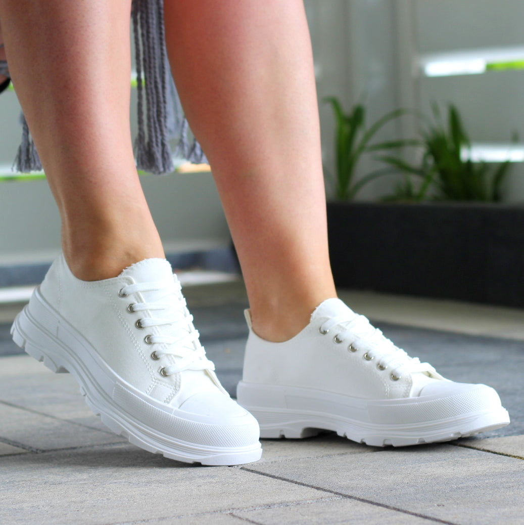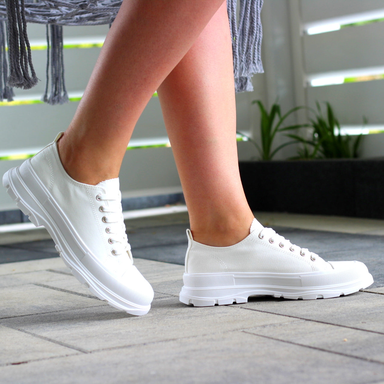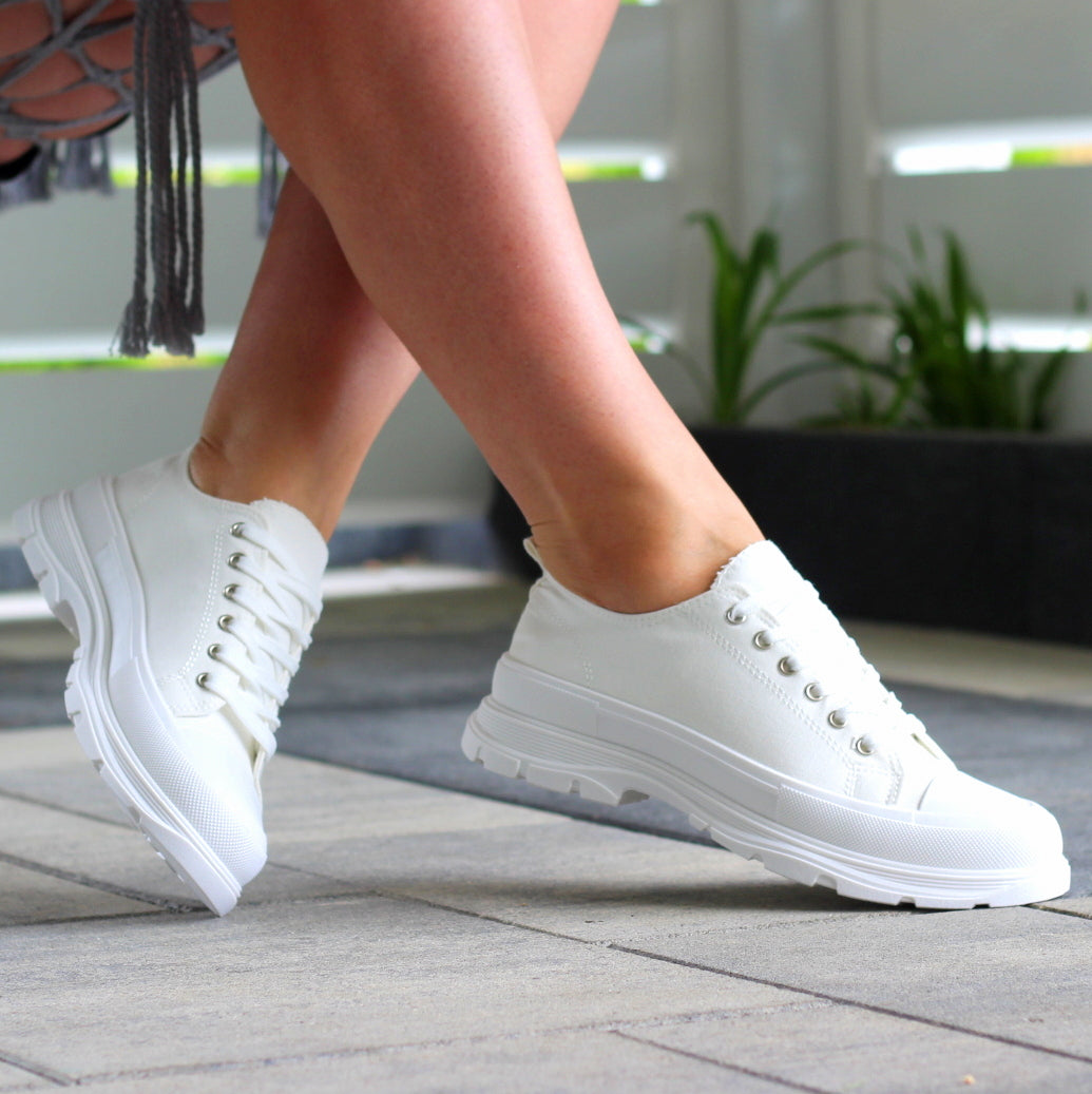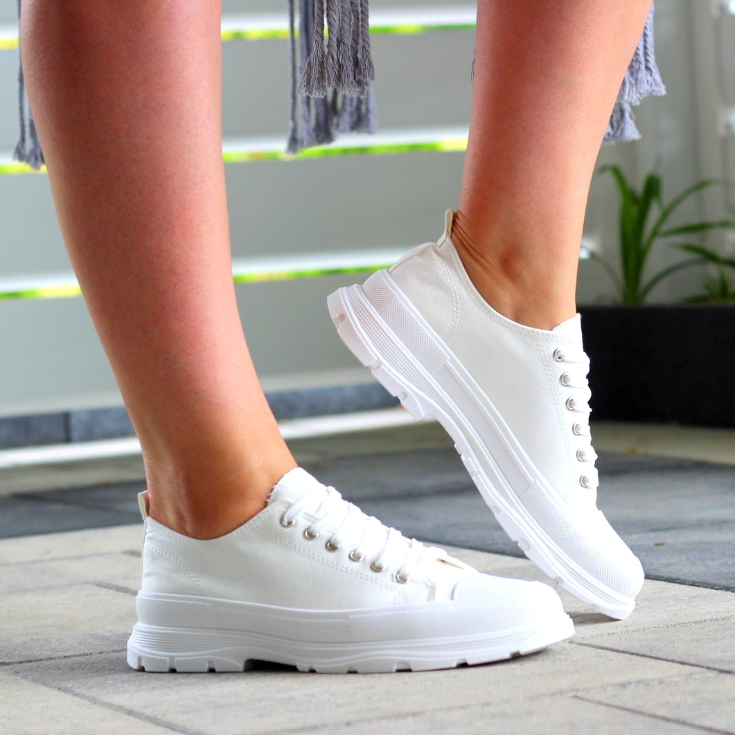 BIAŁE MATERIAŁOWE TRAMPKI DAMSKIE NA GRUBEJ PODESZWIE