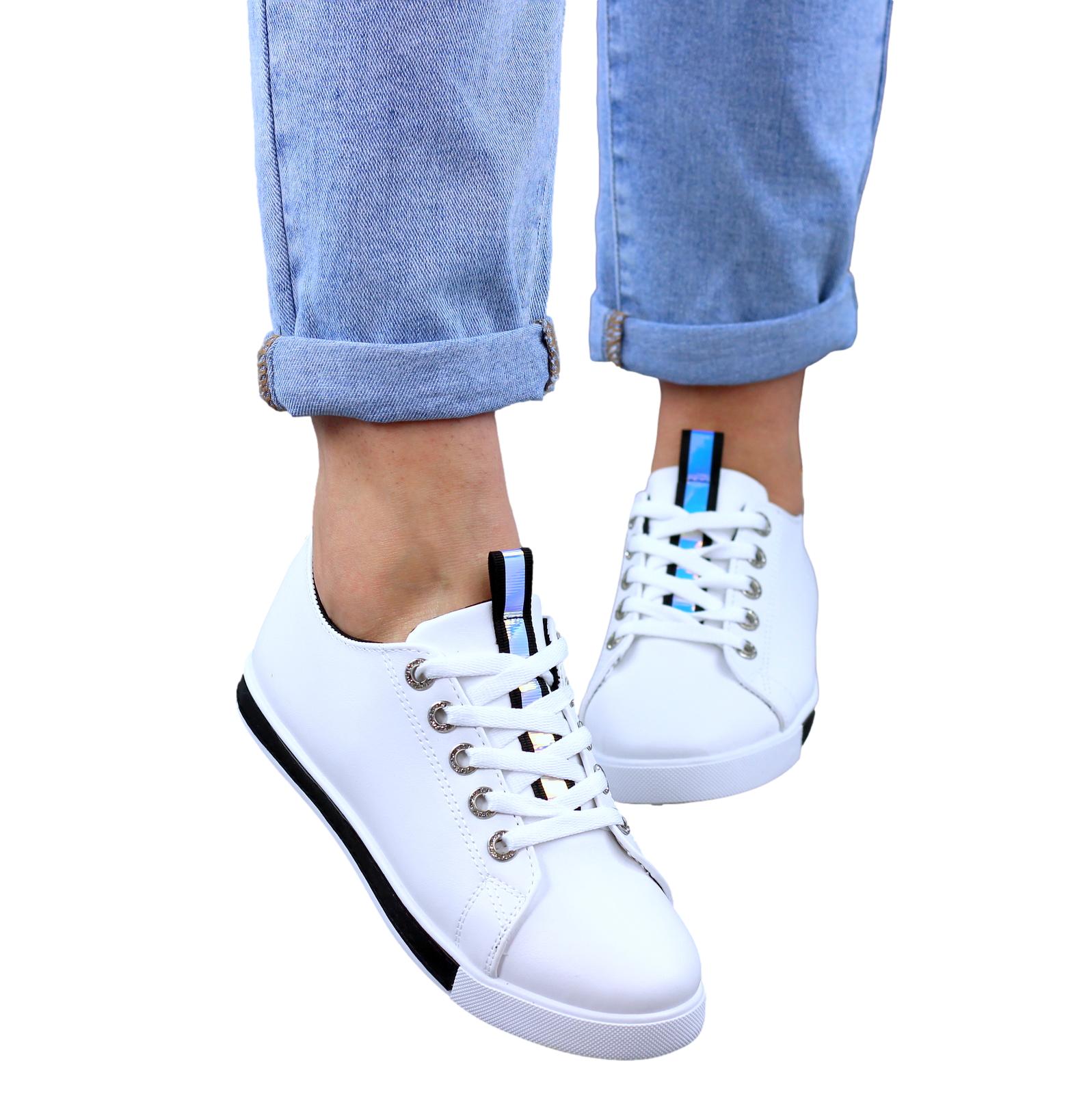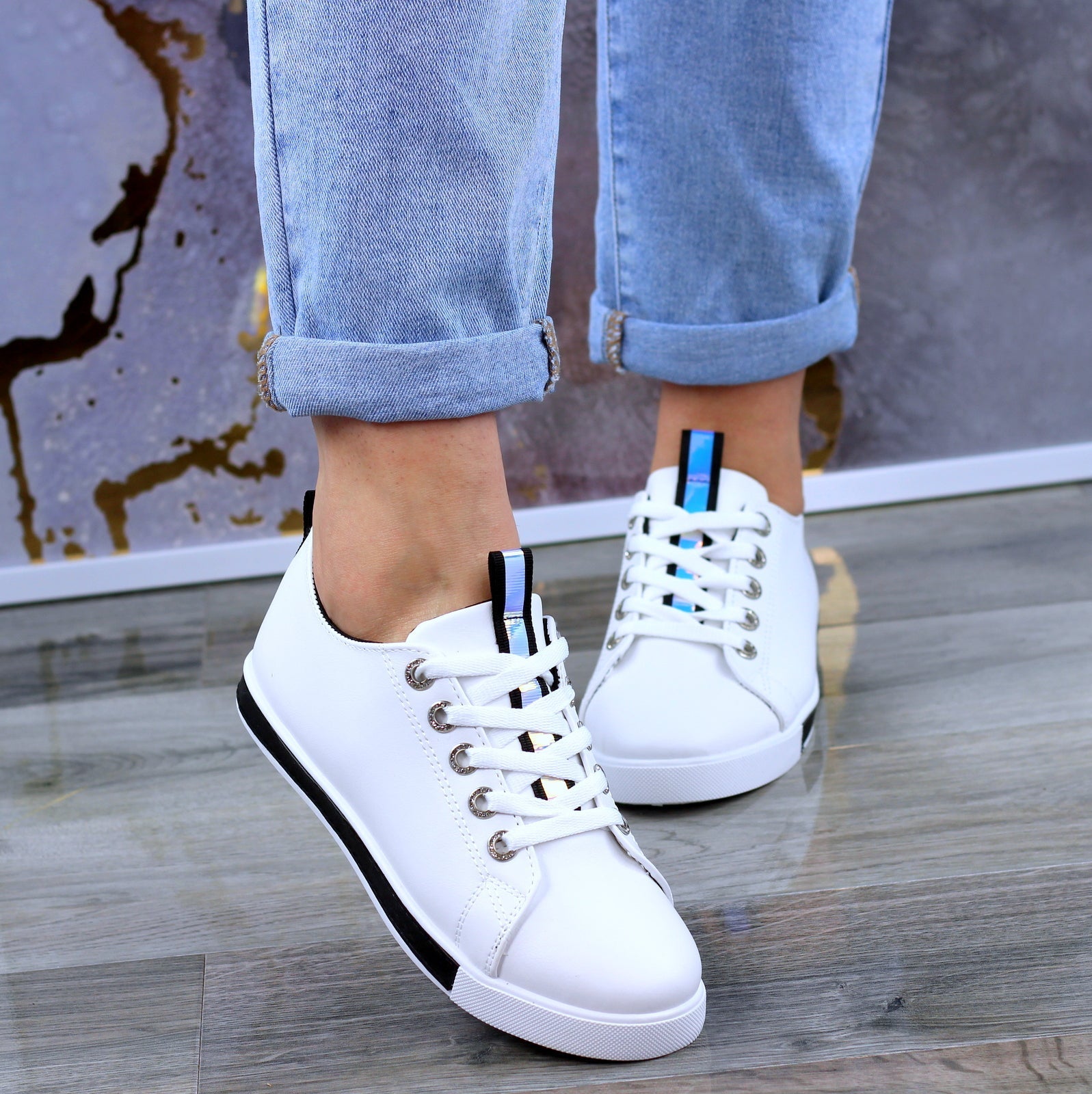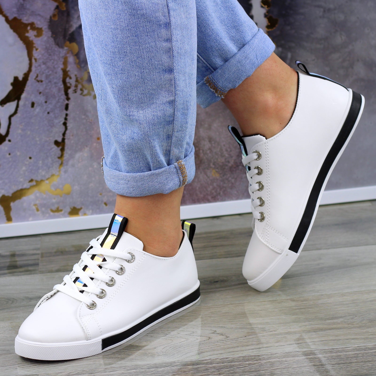BIAŁO CZARNE SKÓRZANE GŁADKIE TRAMPKI DAMSKIE efekt holo
