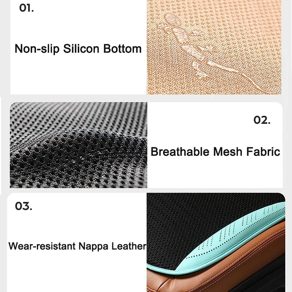 Poduszka na fotel samochodowy wykonana jest z najwyższej jakości tkaniny siatkowej i skóry nappa, która jest miękka, wygodna, oddychająca i odporna na zużycie. Szybko obniża temperaturę i zapewnia ochłodę w upalne lato.