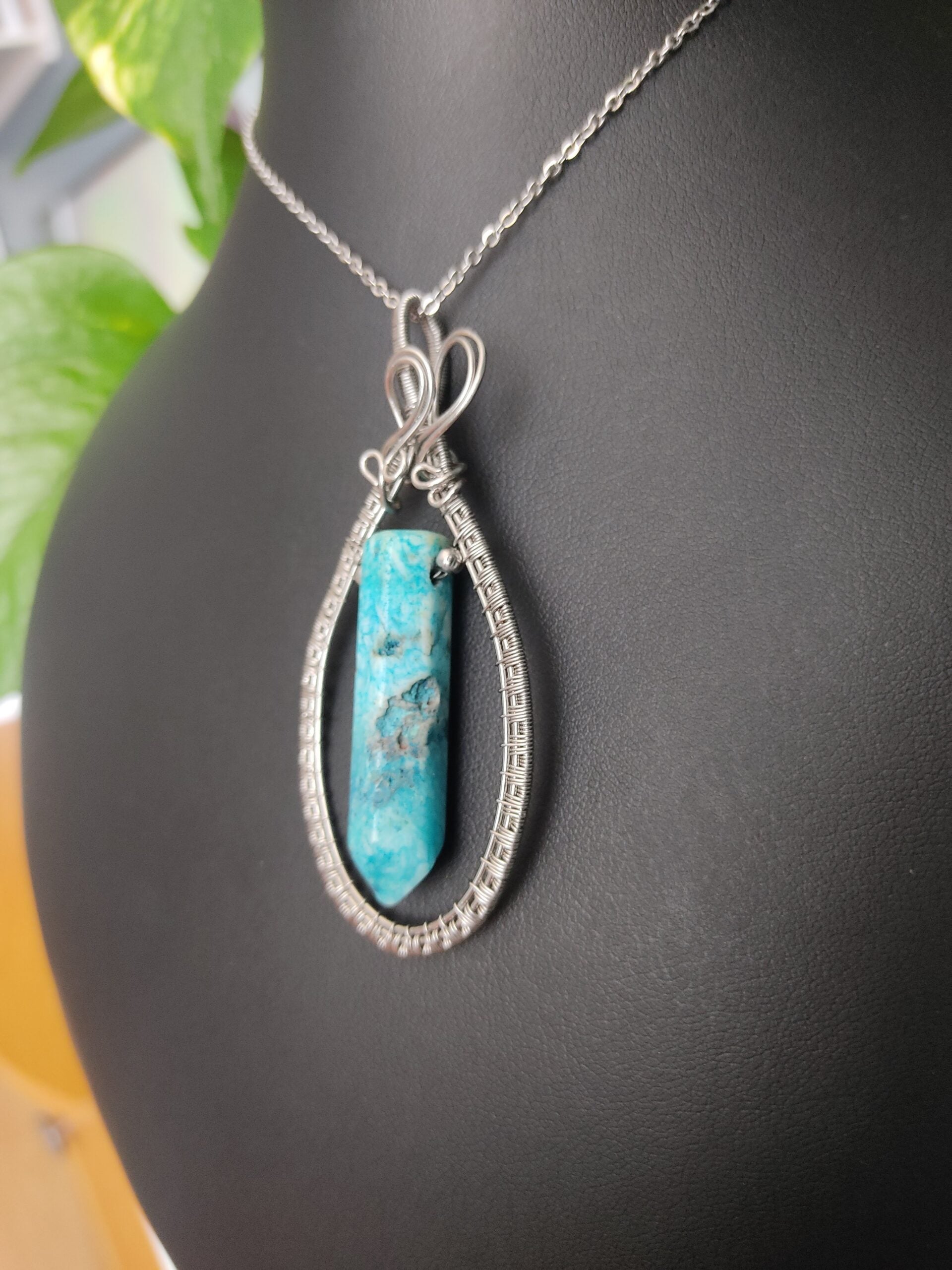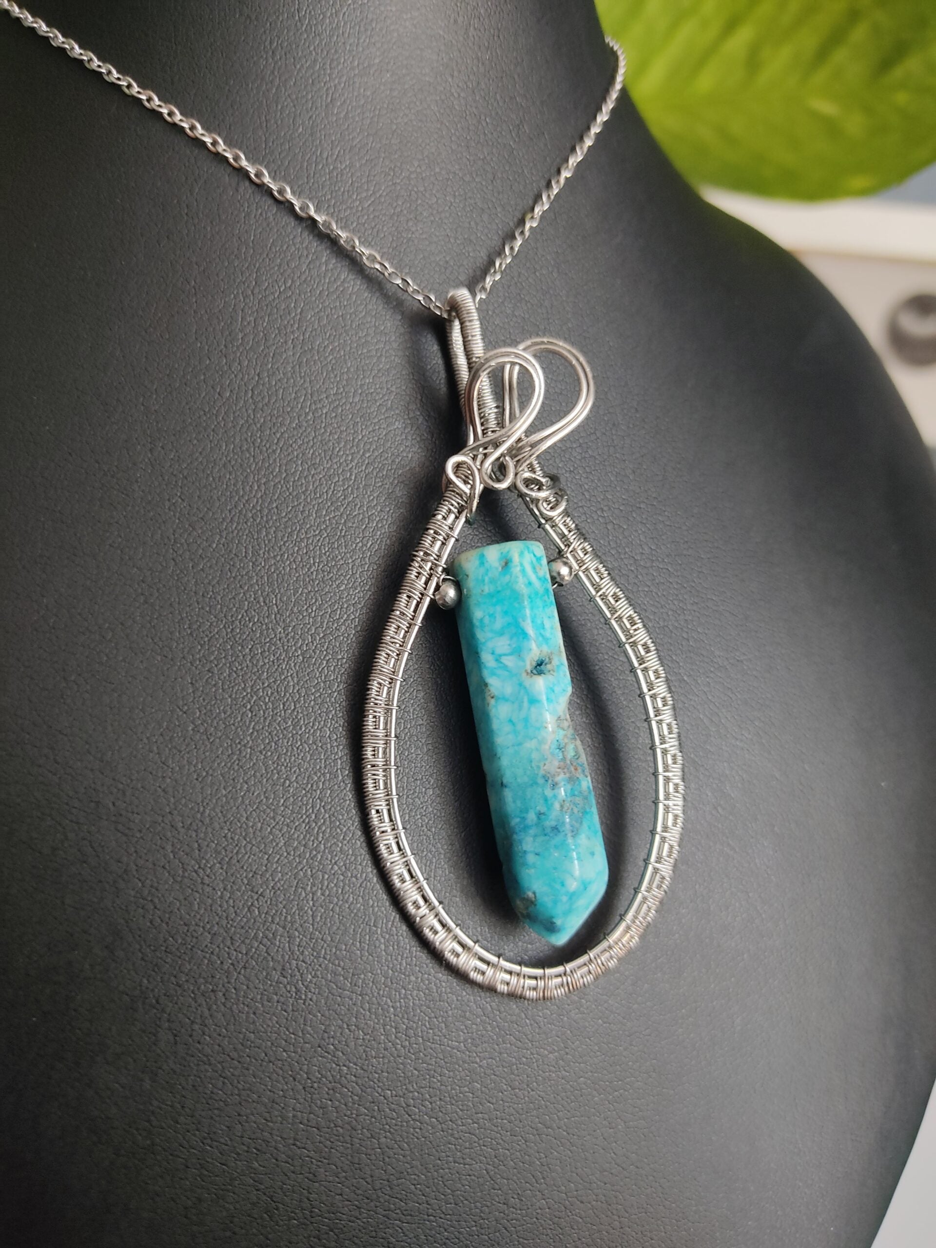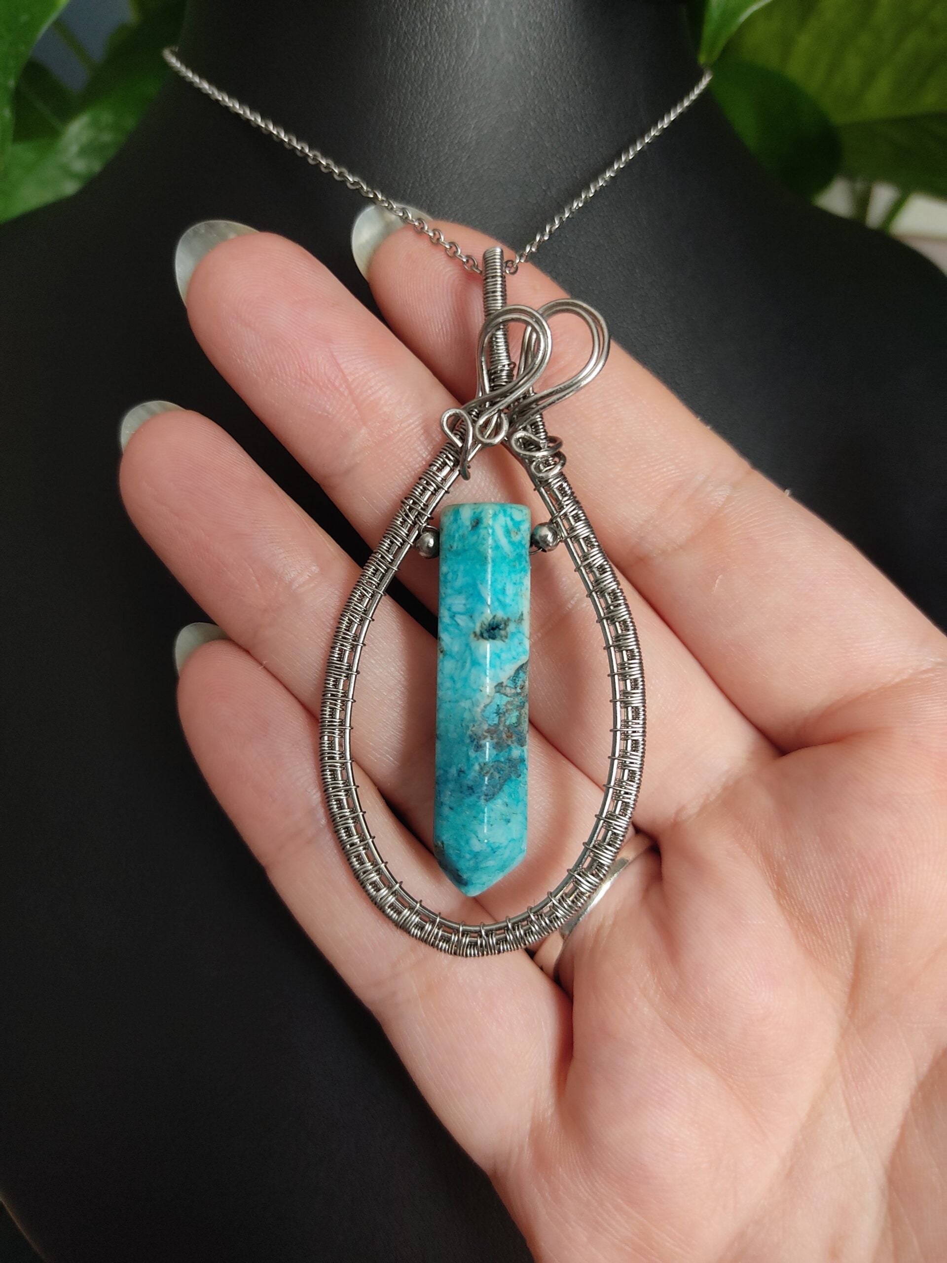 Ręcznie robiony wisiorek z chryzoprazem. Wykonany techniką wire wrapping z drutów ze stali chirurgicznej.
