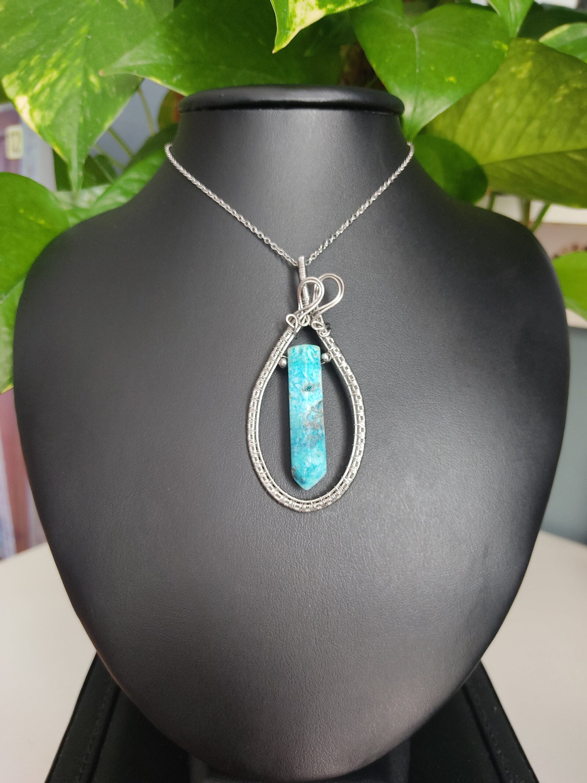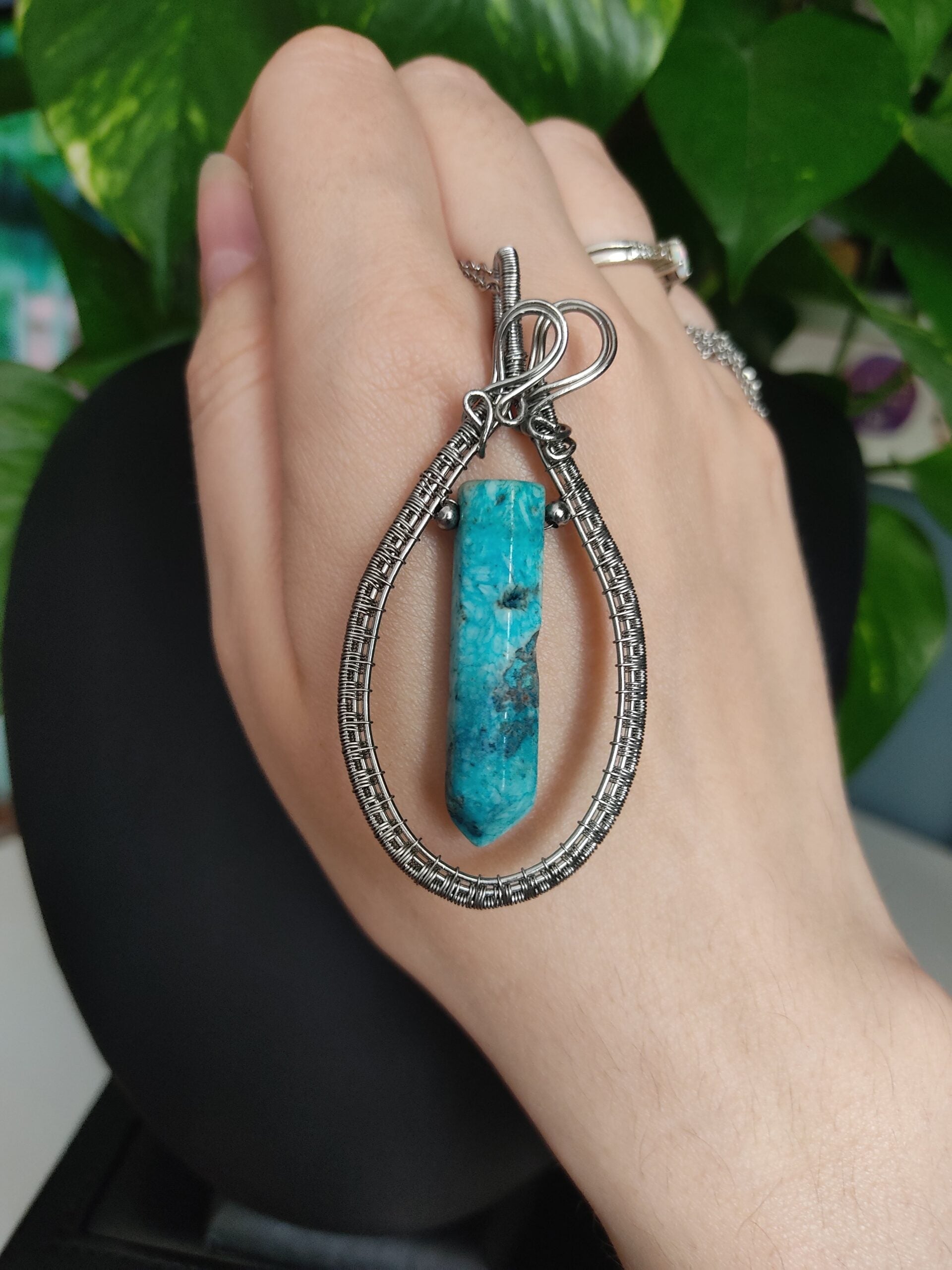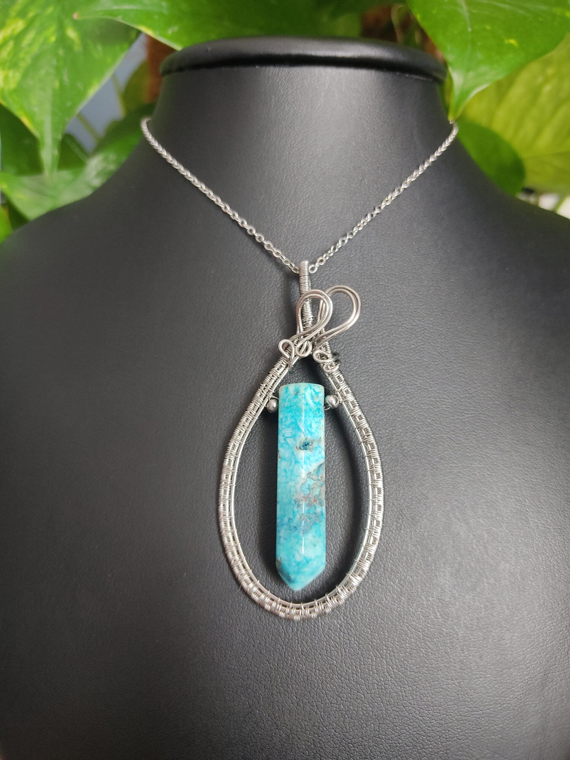 Ręcznie robiony wisiorek z chryzoprazem. Wykonany techniką wire wrapping z drutów ze stali chirurgicznej.