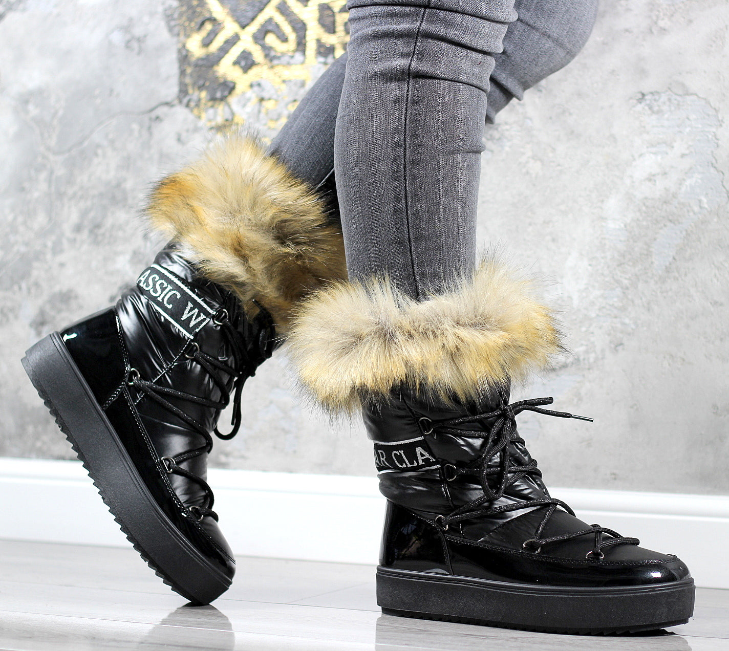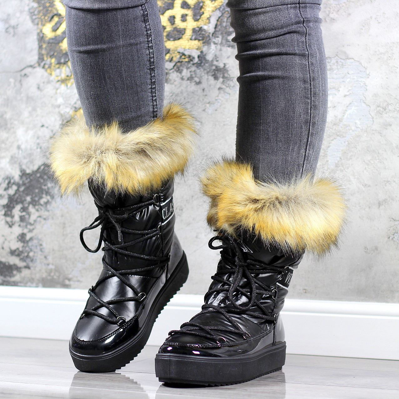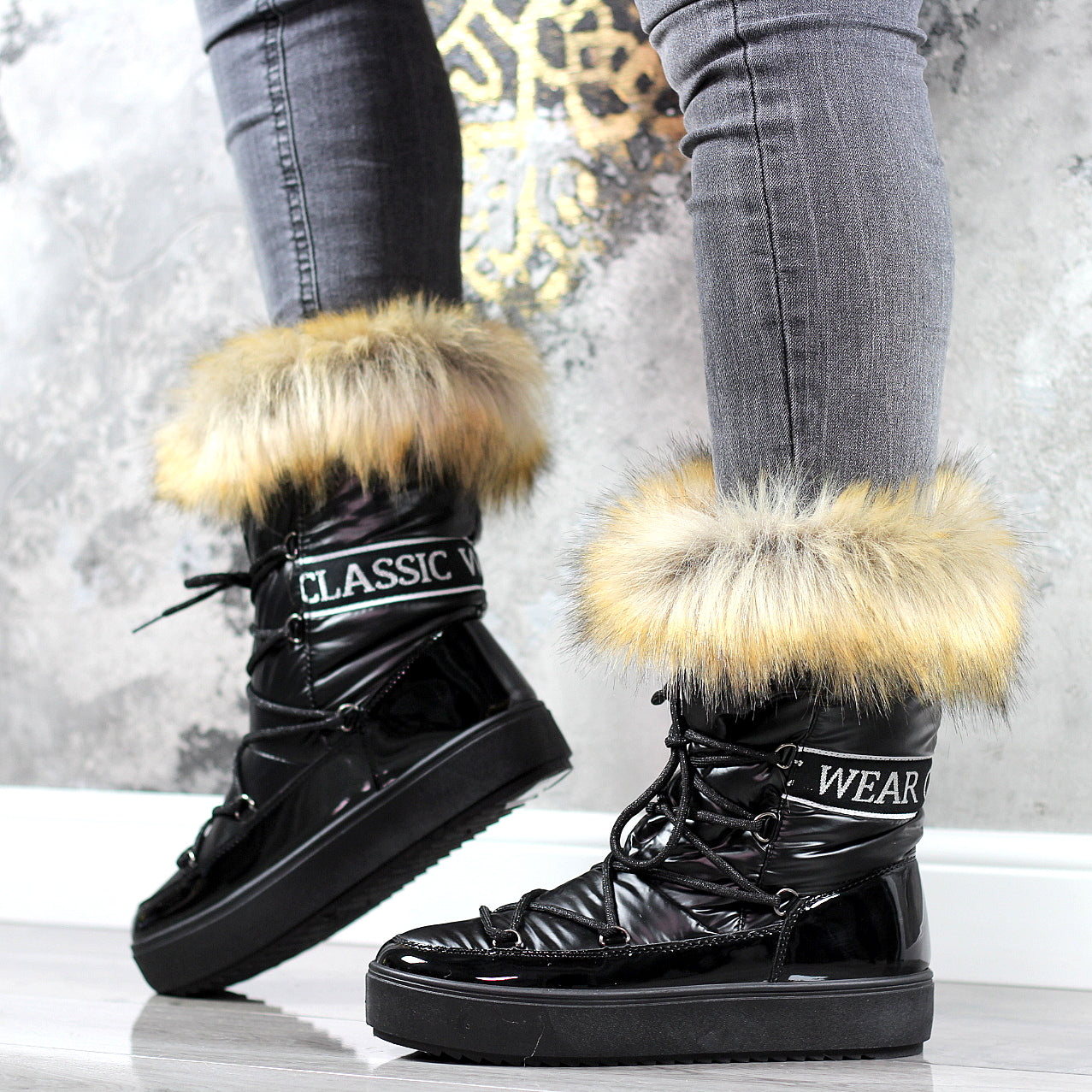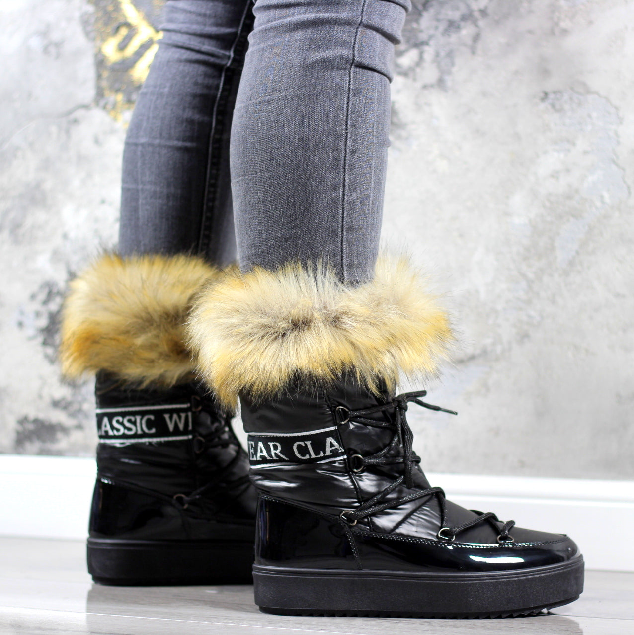 Czarne buty śniegowce eskimoski damskie z futrem Fluo