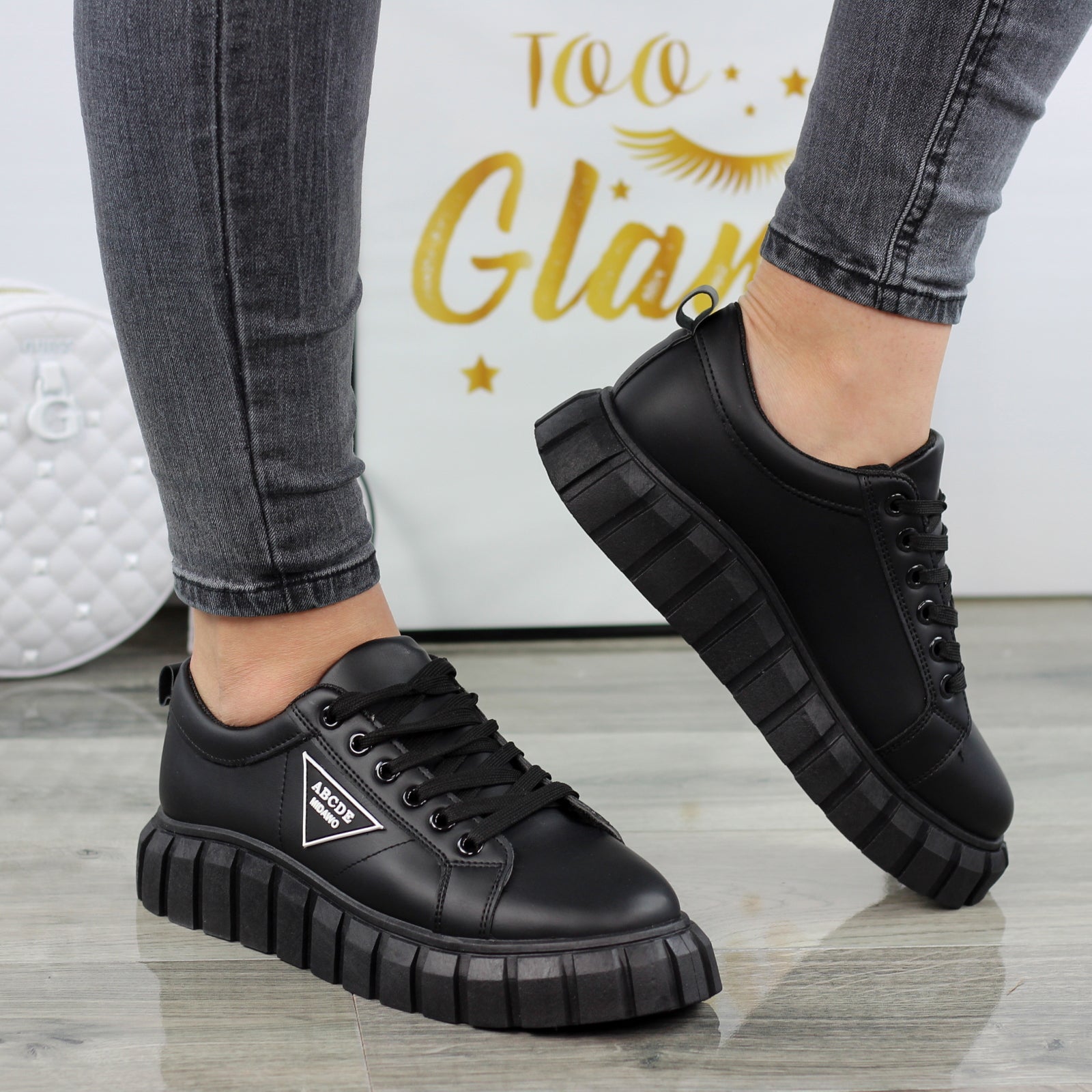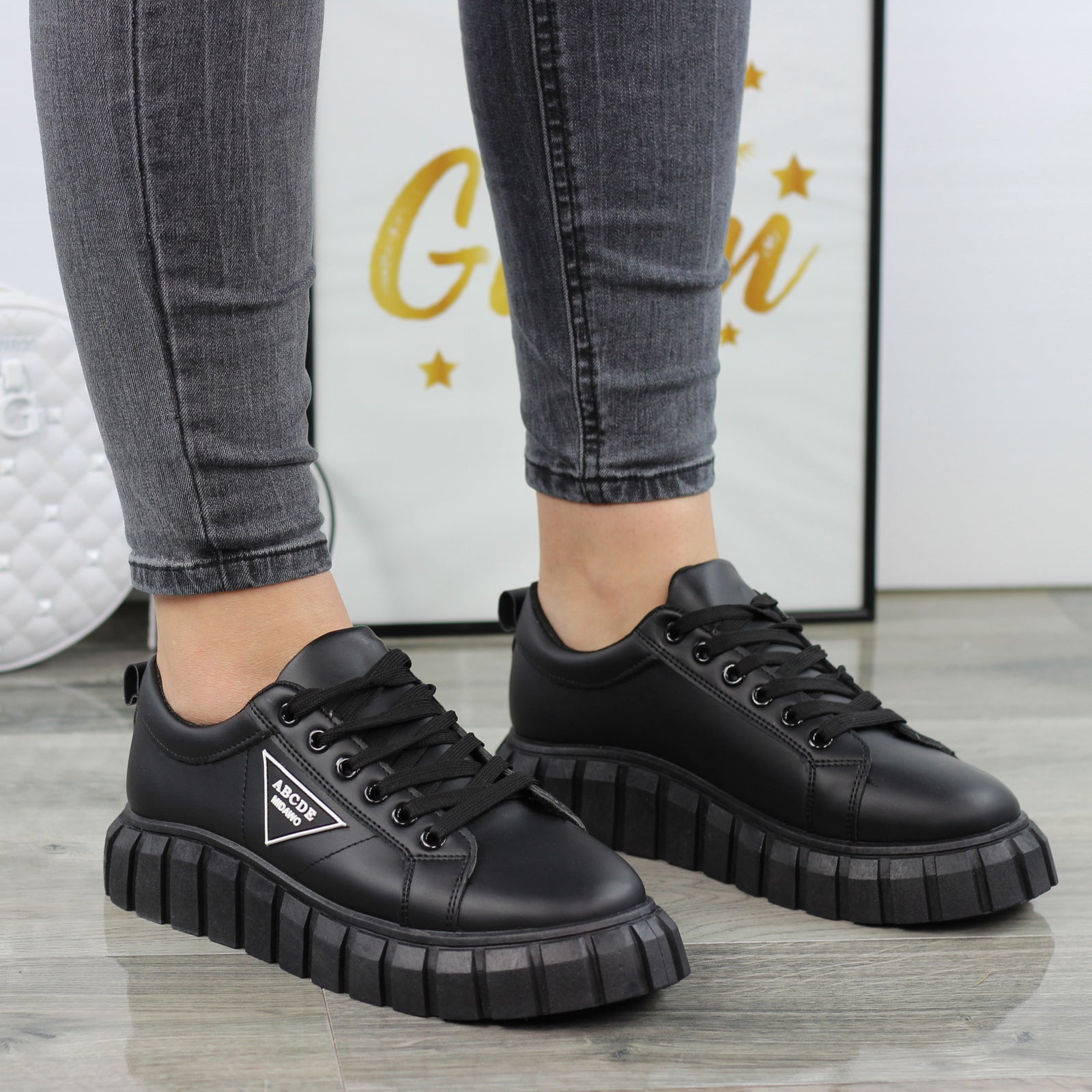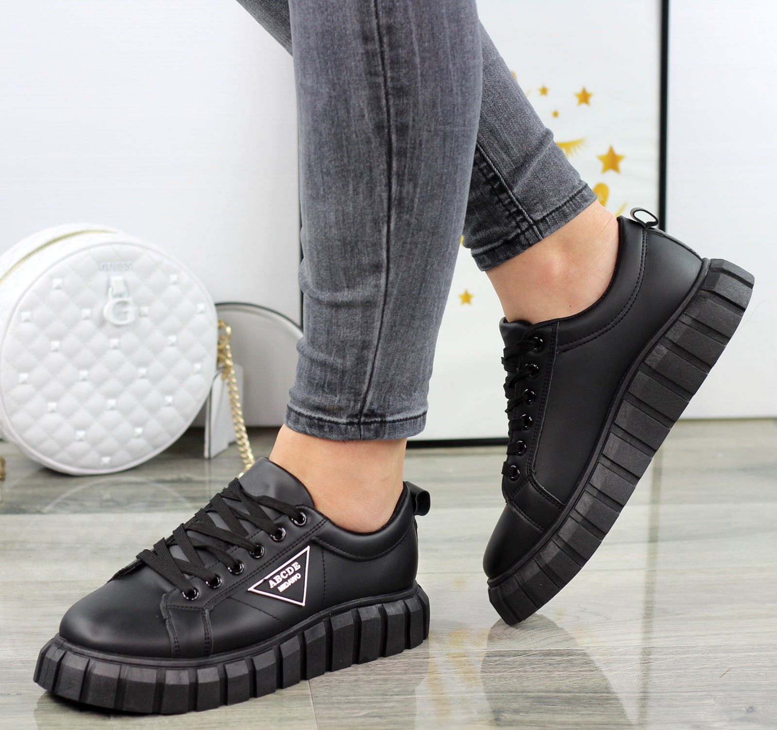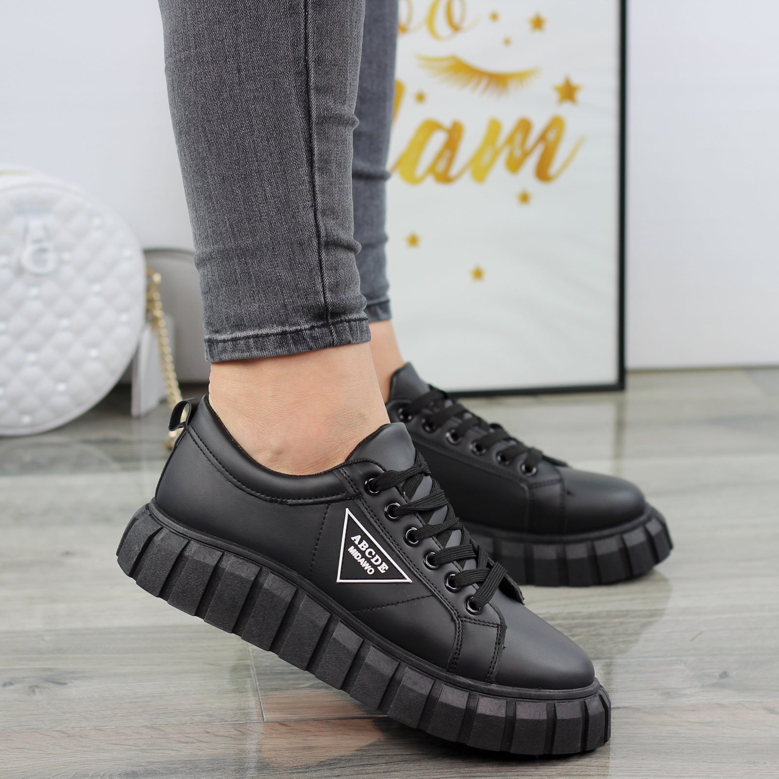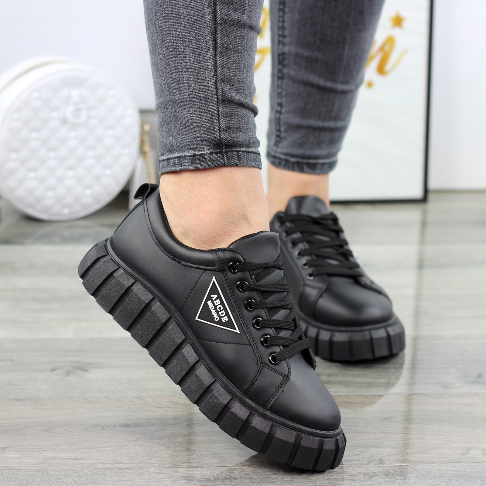 CZARNE SKÓRZANE TRAMPKI DAMSKIE NA GRUBEJ PODESZWIE