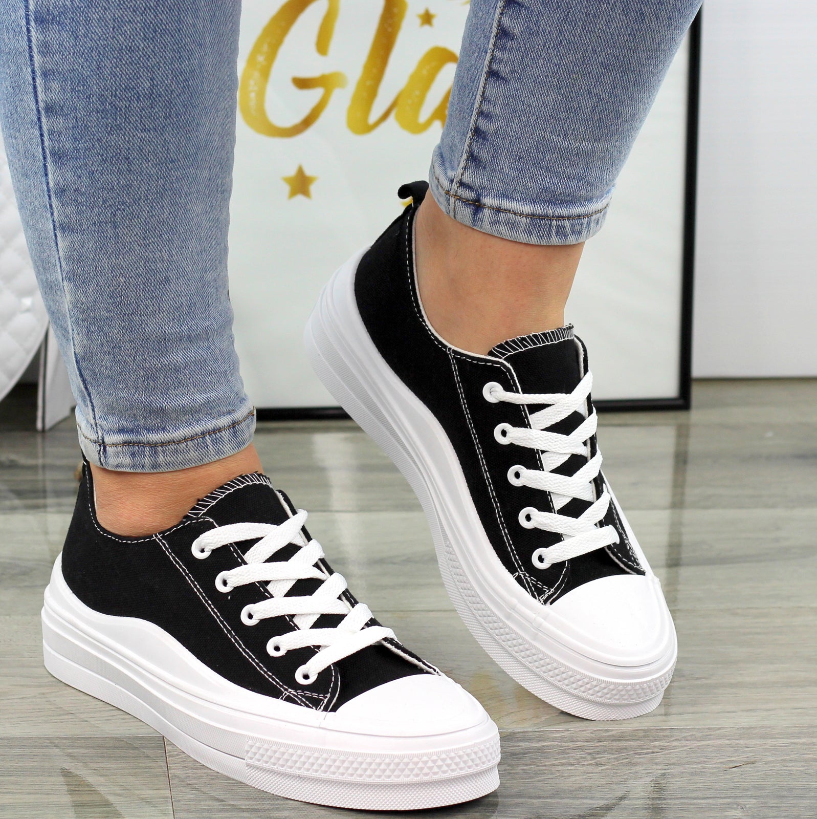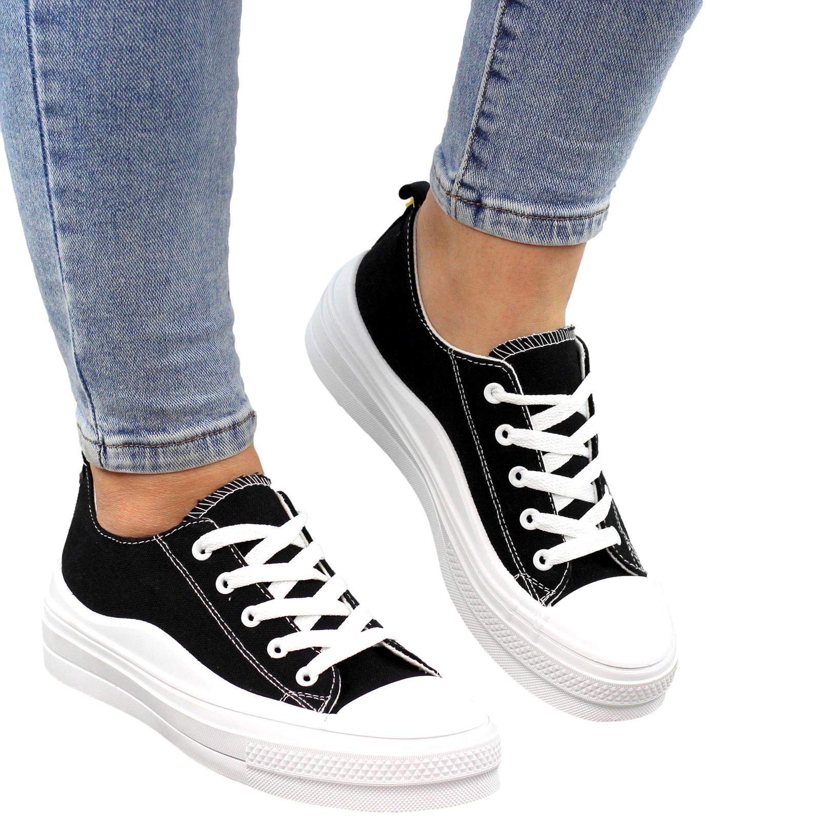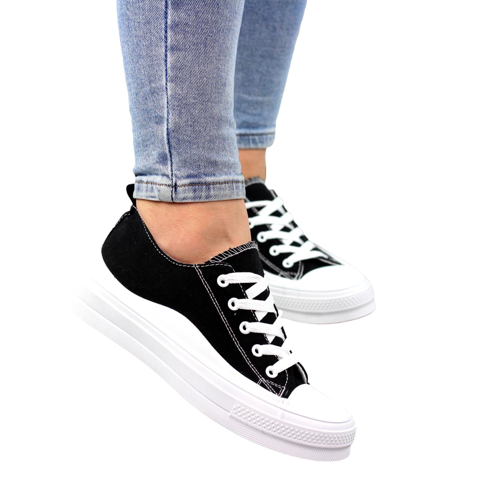 CZARNE MATERIAŁOWE TRAMPKI DAMSKIE NA GRUBEJ PODESZWIE