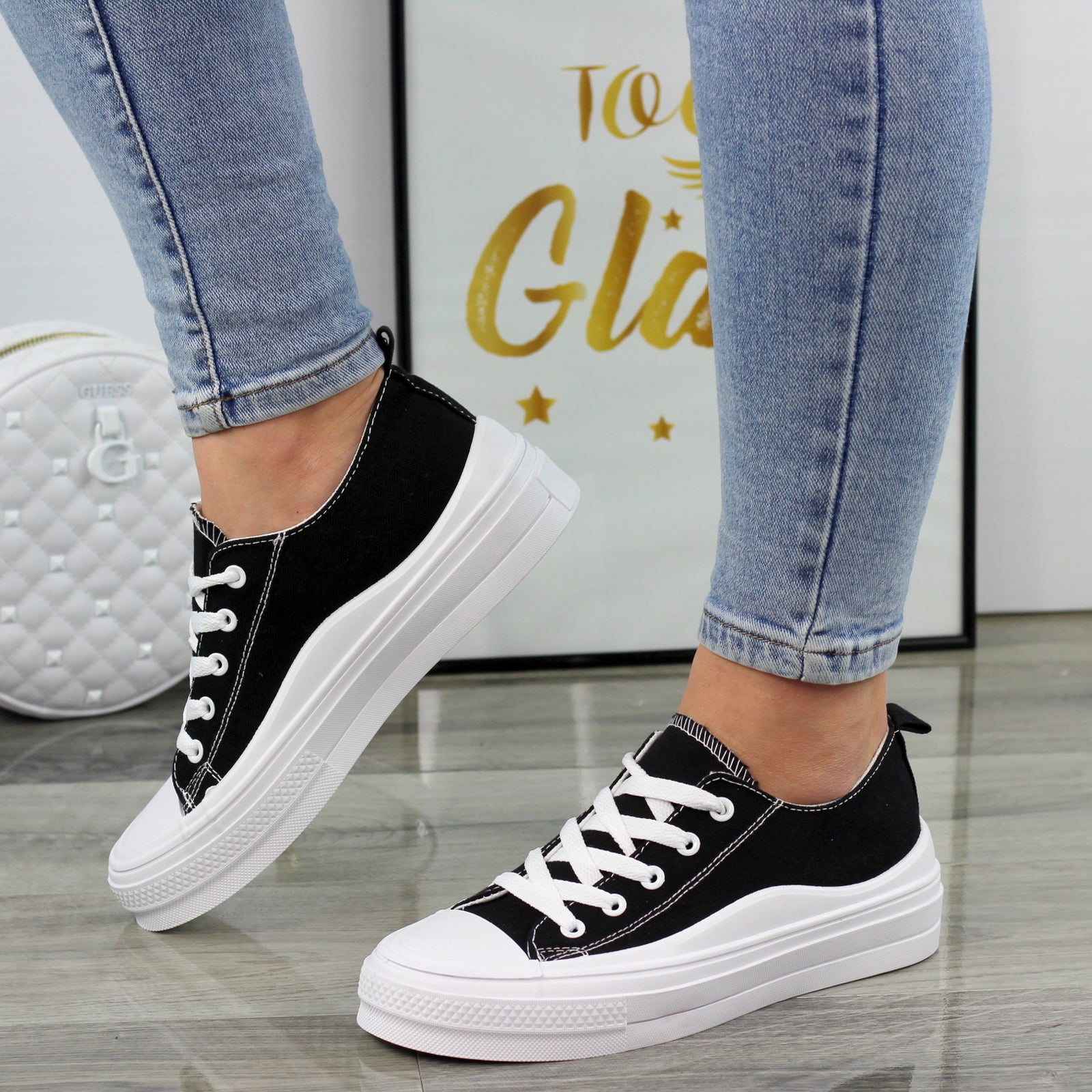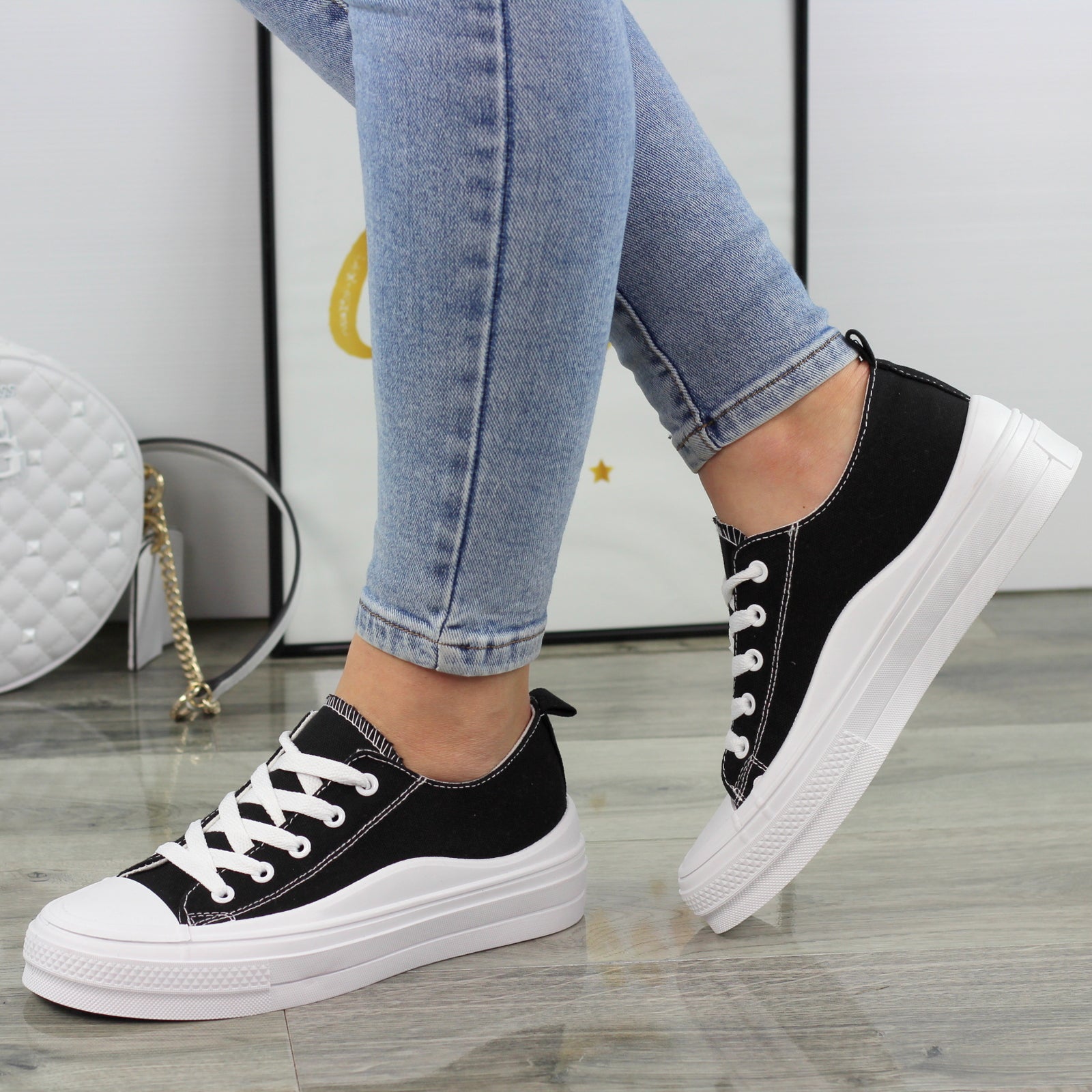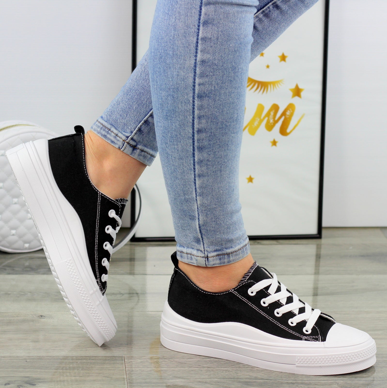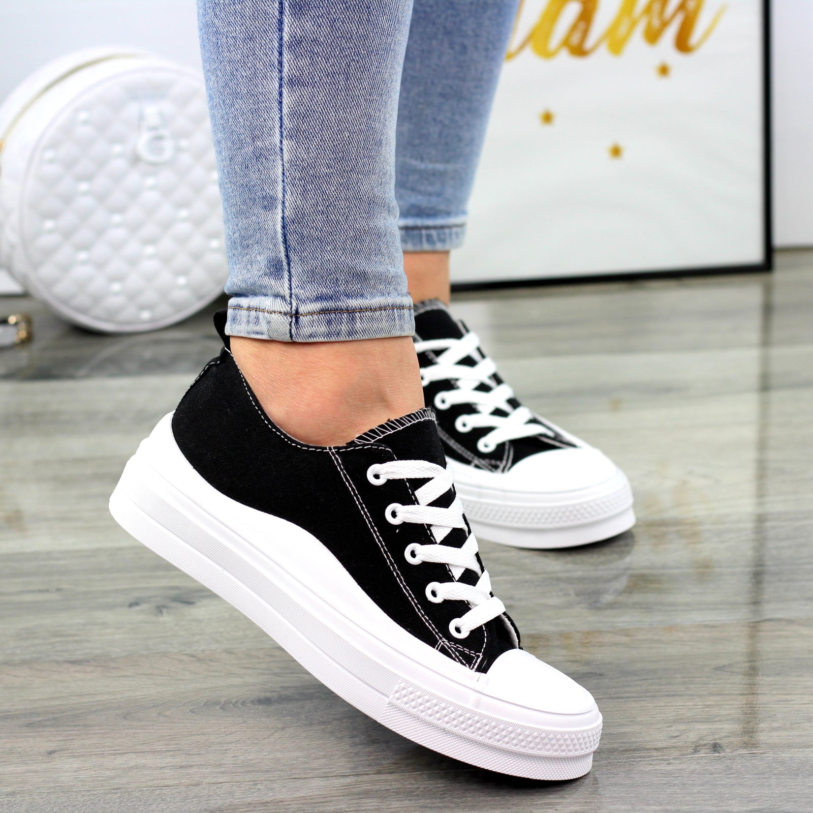 CZARNE MATERIAŁOWE TRAMPKI DAMSKIE NA GRUBEJ PODESZWIE