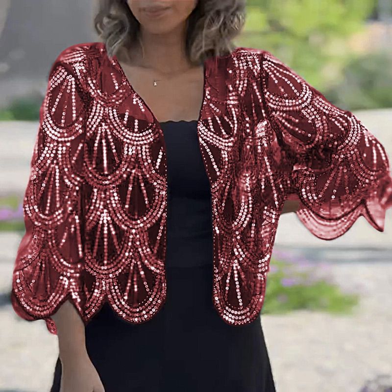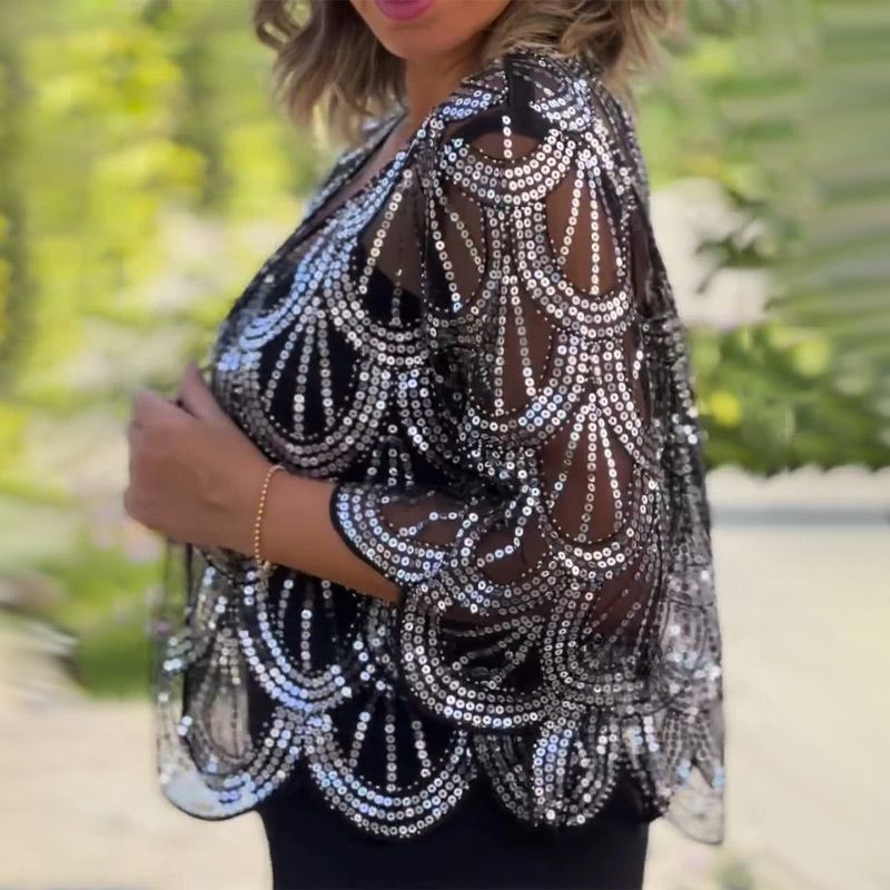 WZÓR: Szal wieczorowy składa się z przezroczystego kardiganu i ozdobiony cekinami, aby dopełnić kobiecy kształt ciała. Noś go, aby pokazać swoją najskromniejszą i najpiękniejszą stronę.