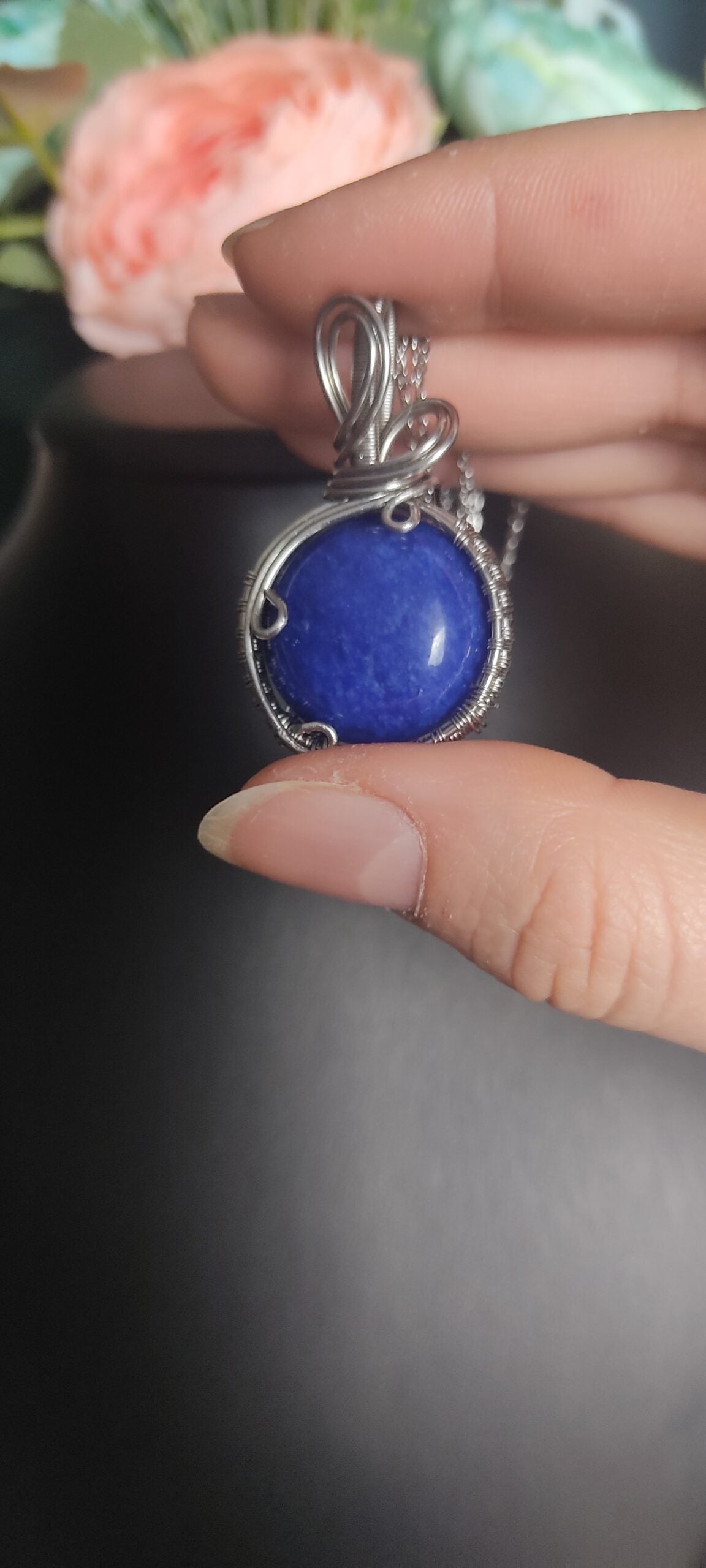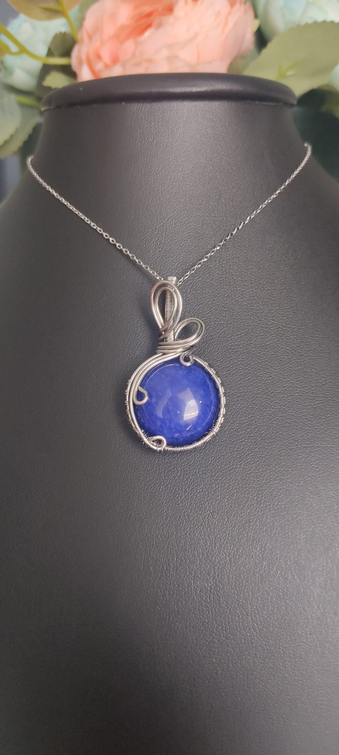Ręcznie robiony wisiorek z jadeitem. Wykonany techniką wire wrapping z drutów ze stali chirurgicznej.