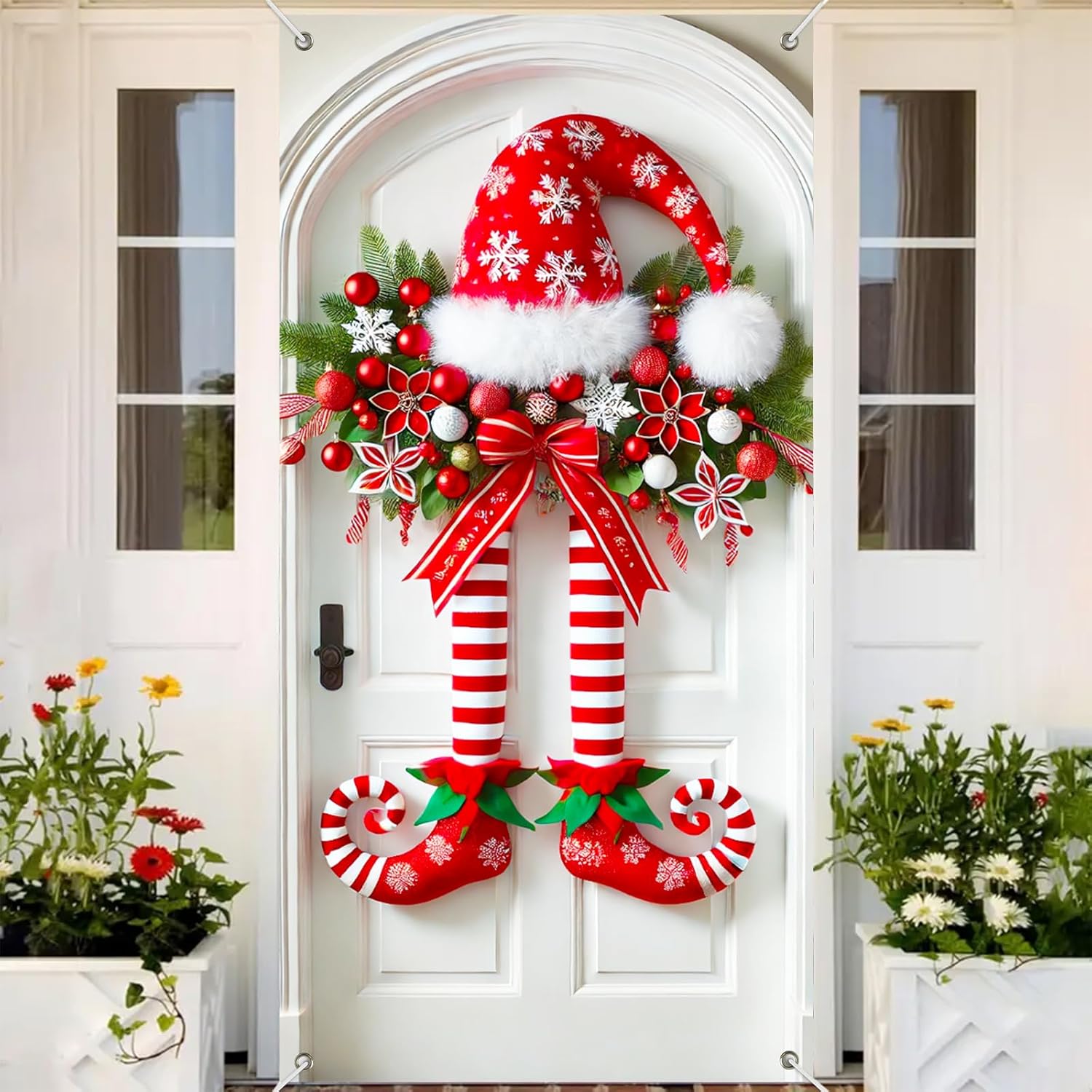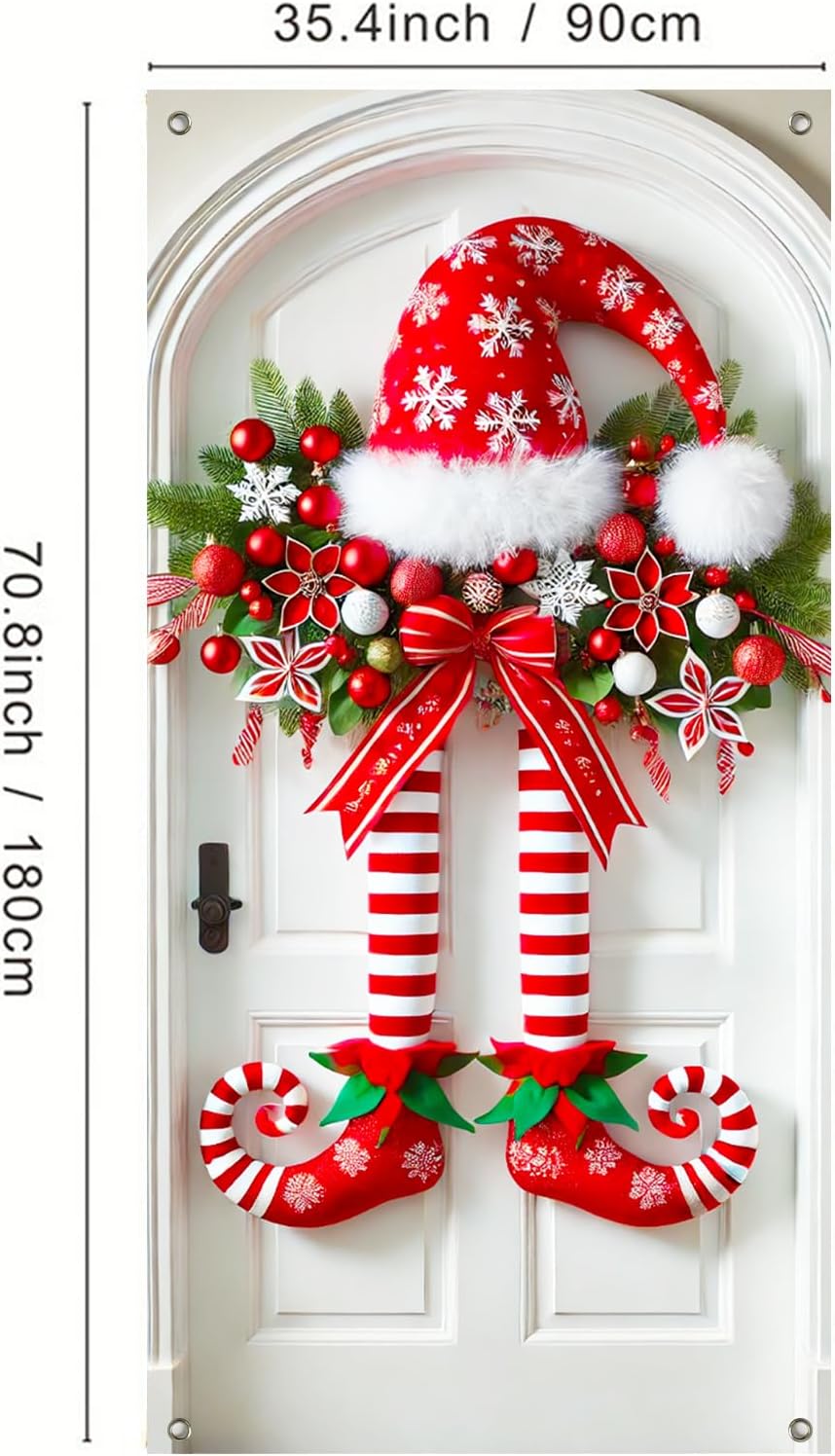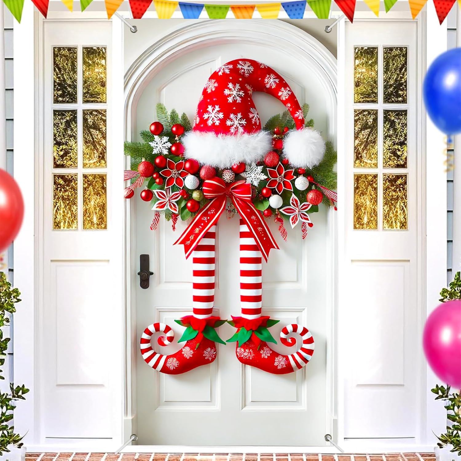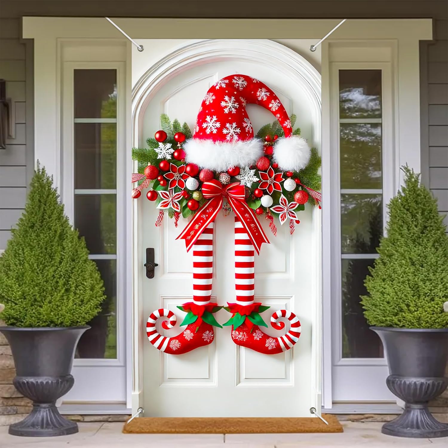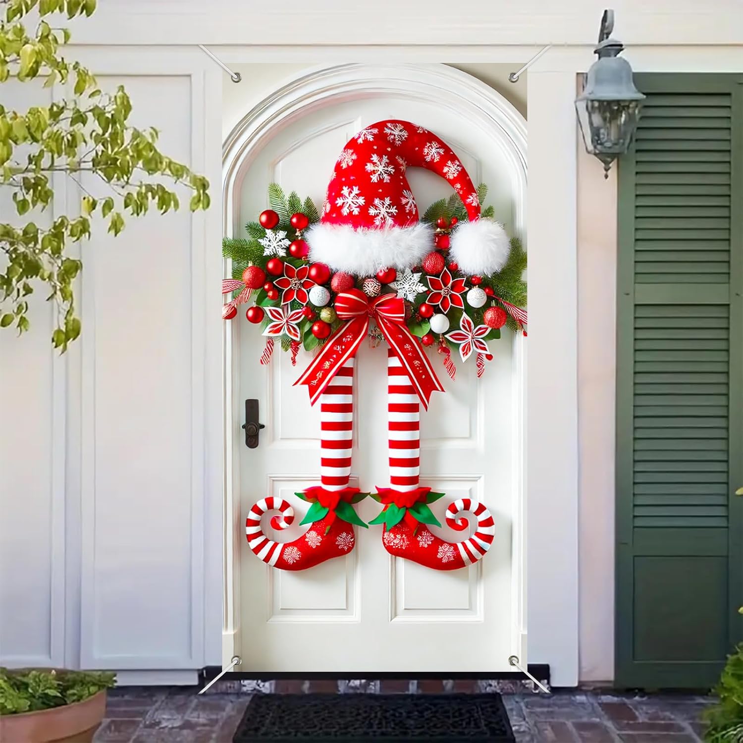 Zabawny motyw nóg elfa: z nogami elfa w paski, kręconymi butami, czapką w kształcie płatka śniegu i świątecznymi dekoracjami, ten baner tworzy żywą świąteczną atmosferę na werandzie lub imprezie.
