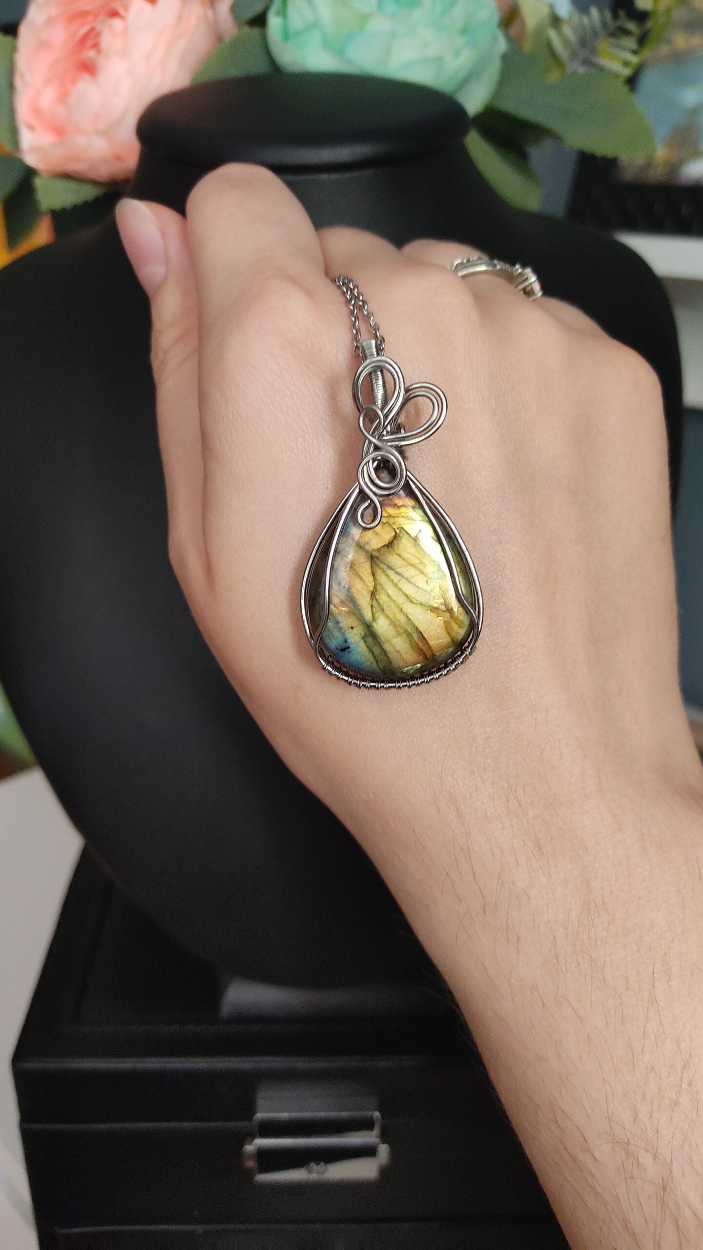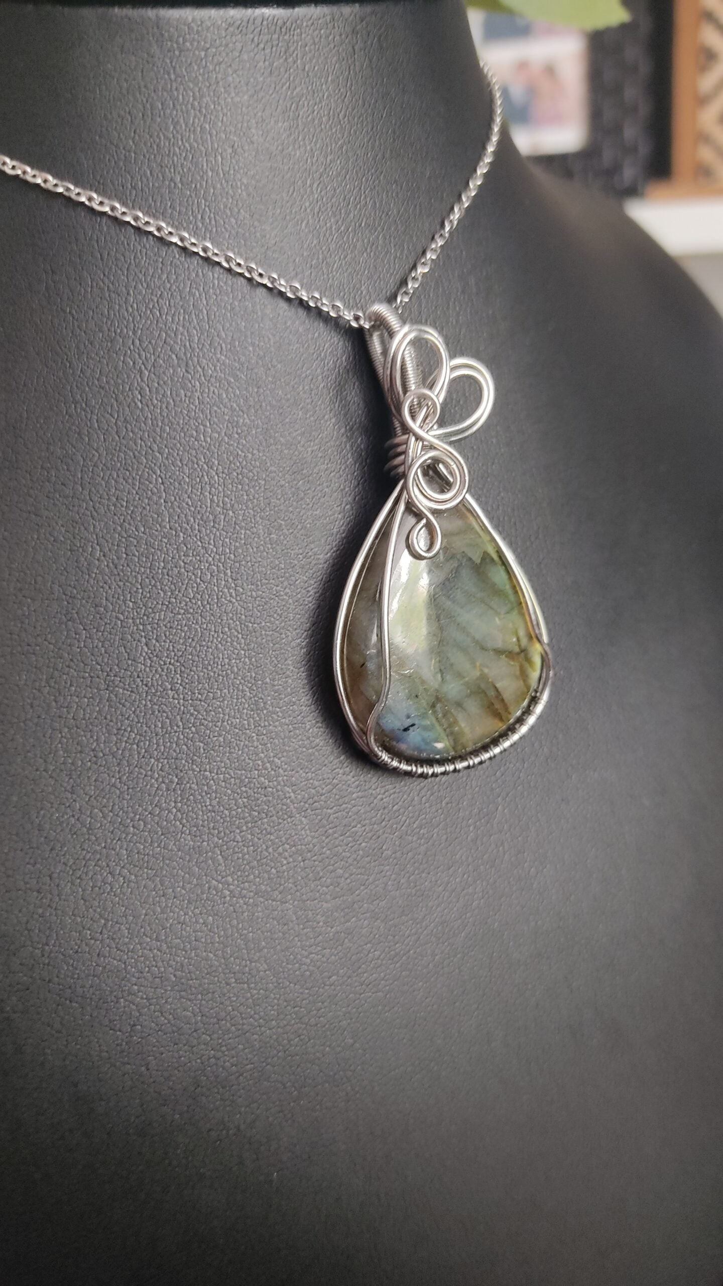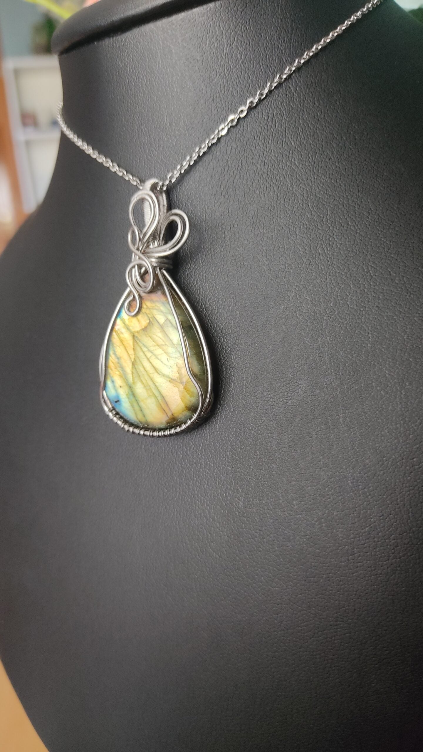 Ręcznie robiony wisiorek z labradorytem. Wykonany techniką wire wrapping z drutów ze stali chirurgicznej.