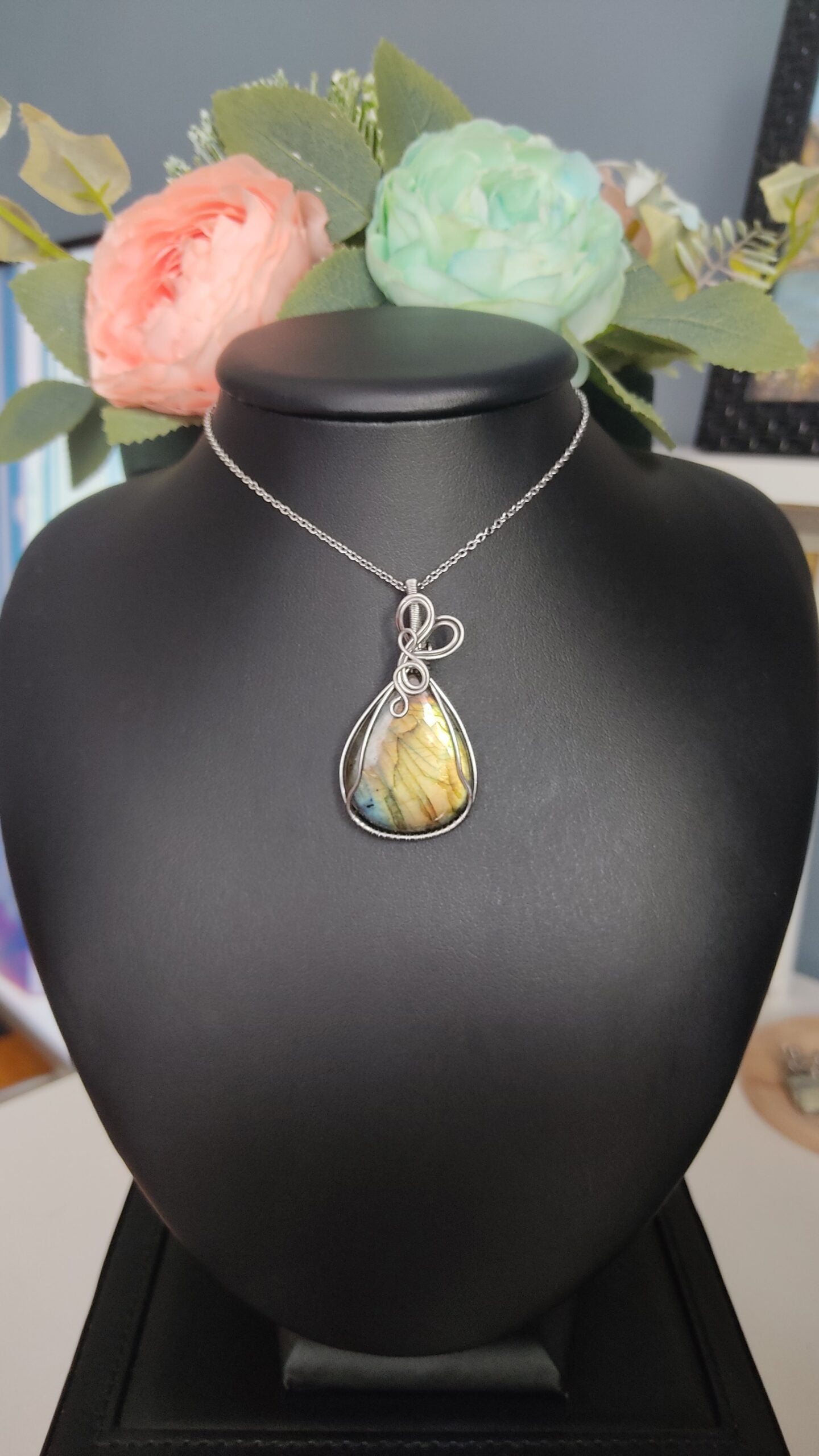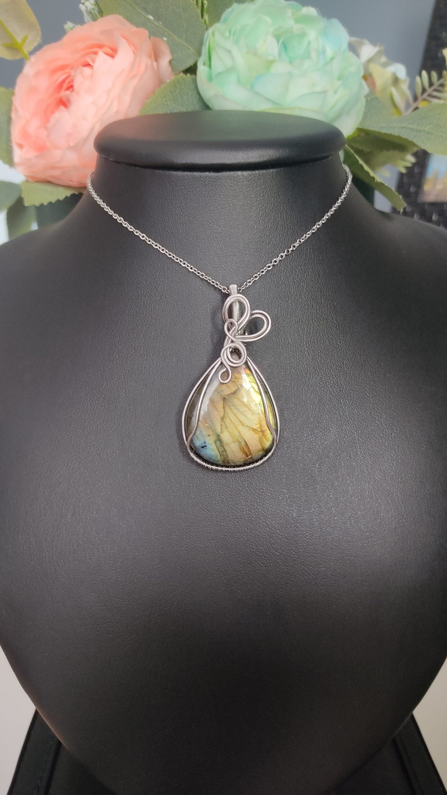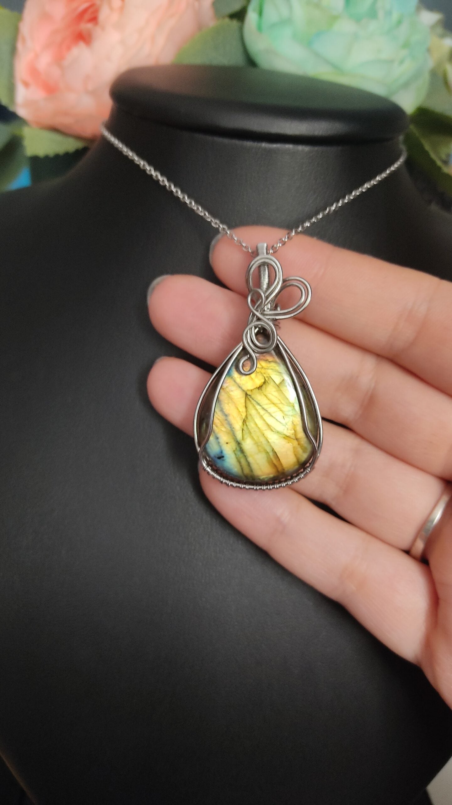 Ręcznie robiony wisiorek z labradorytem. Wykonany techniką wire wrapping z drutów ze stali chirurgicznej.
