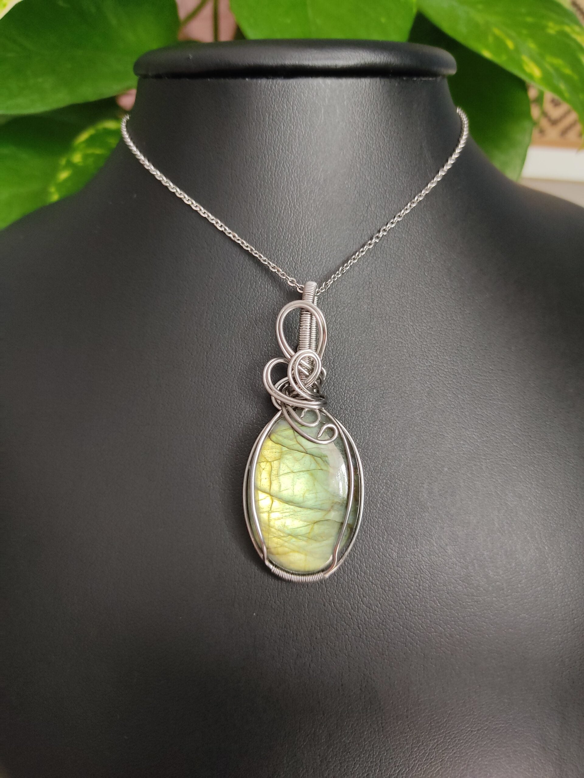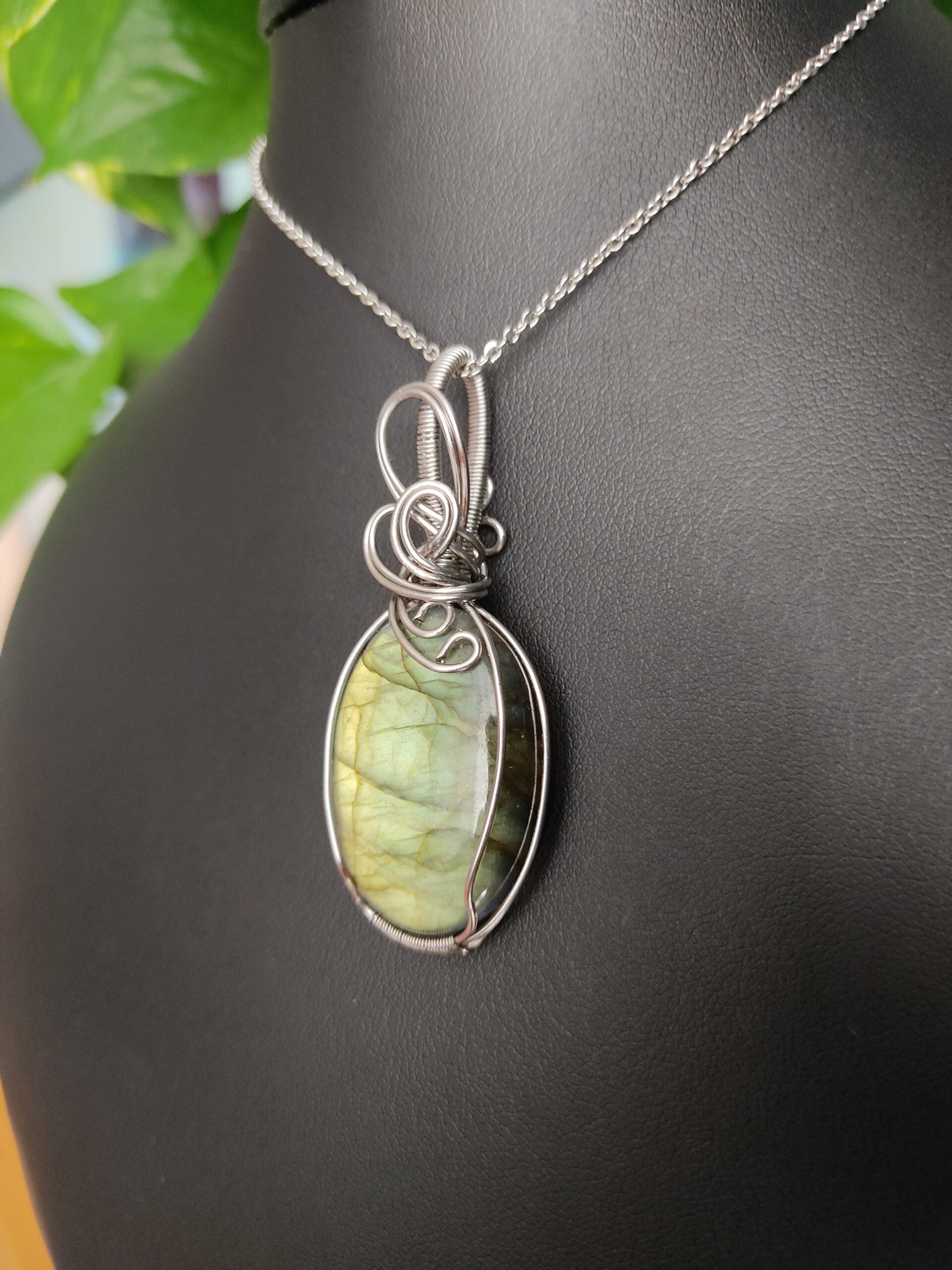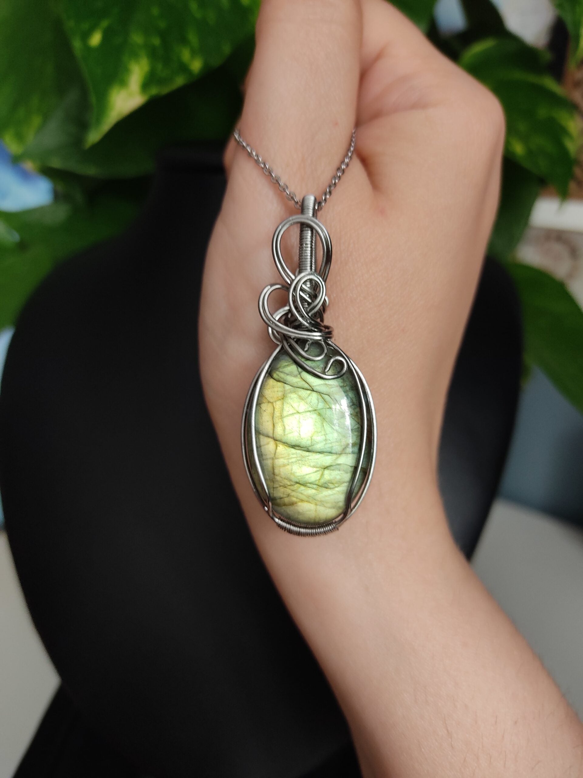 Ręcznie robiony wisiorek z labradorytem. Wykonany techniką wire wrapping z drutów ze stali chirurgicznej.