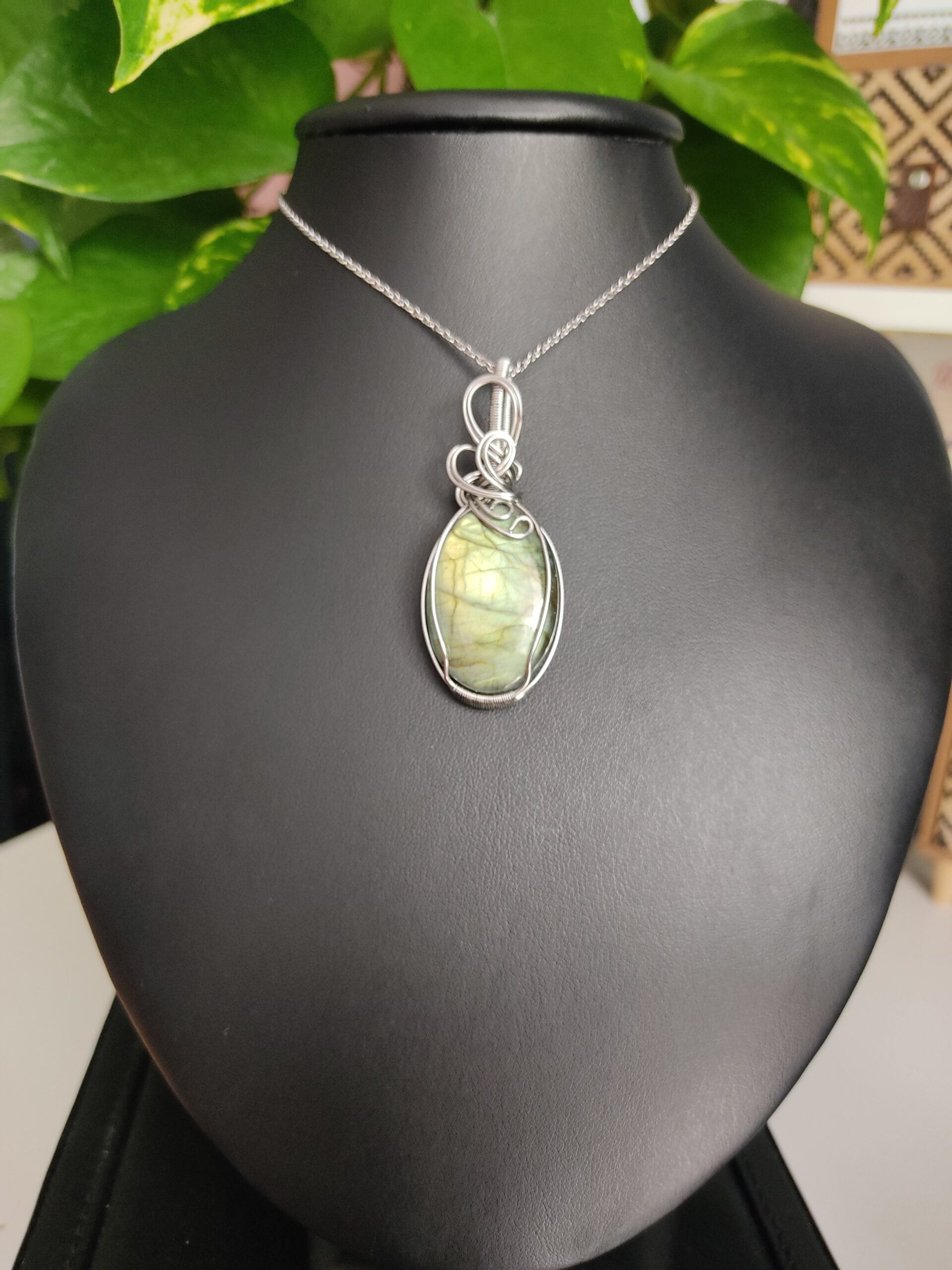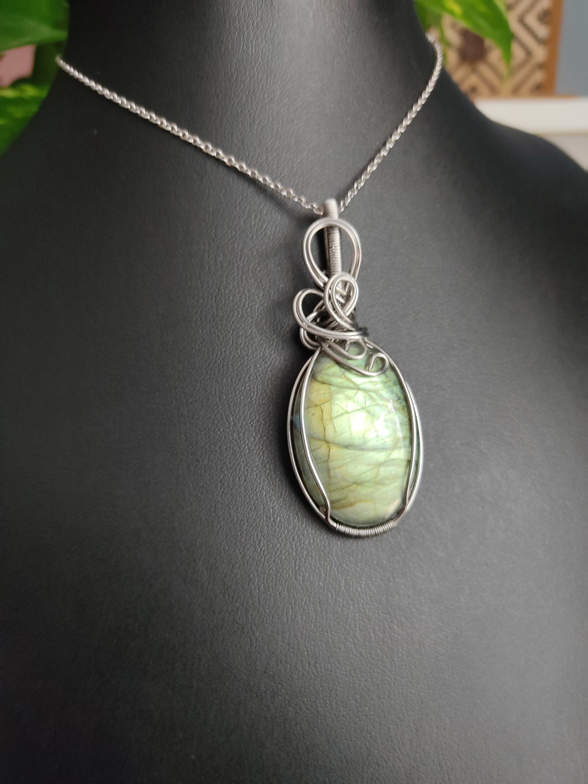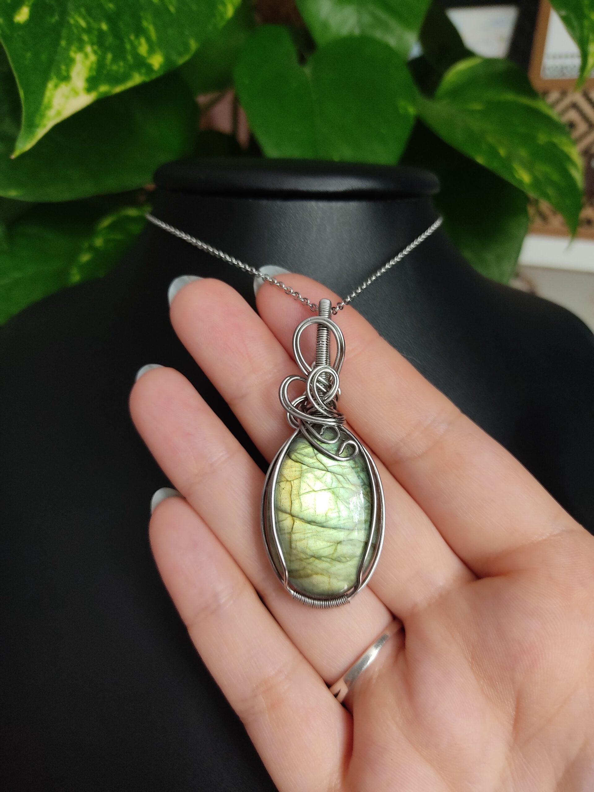 Ręcznie robiony wisiorek z labradorytem. Wykonany techniką wire wrapping z drutów ze stali chirurgicznej.