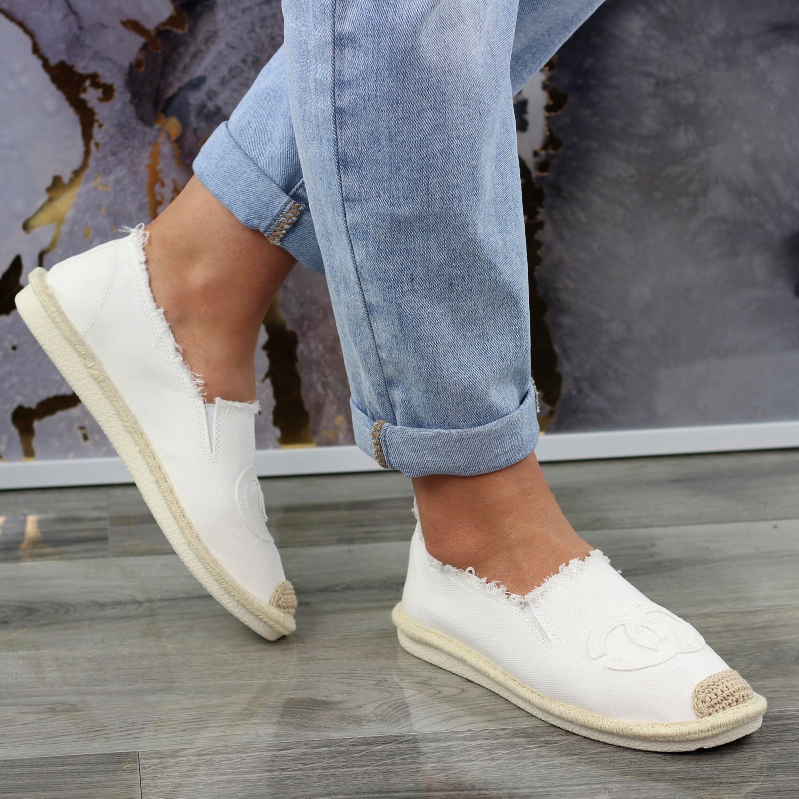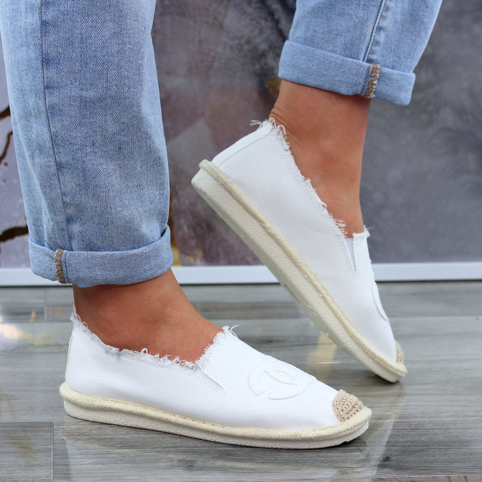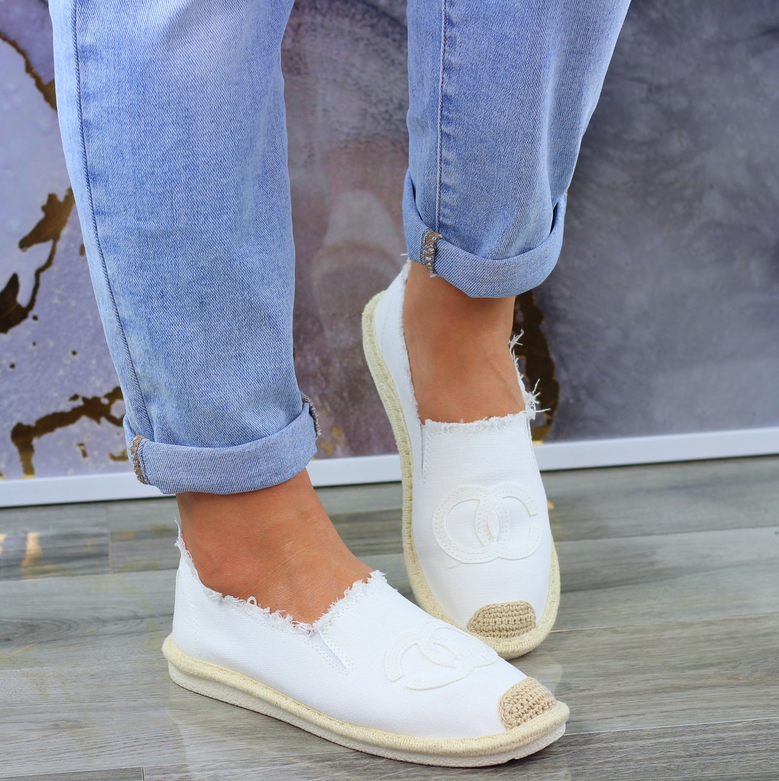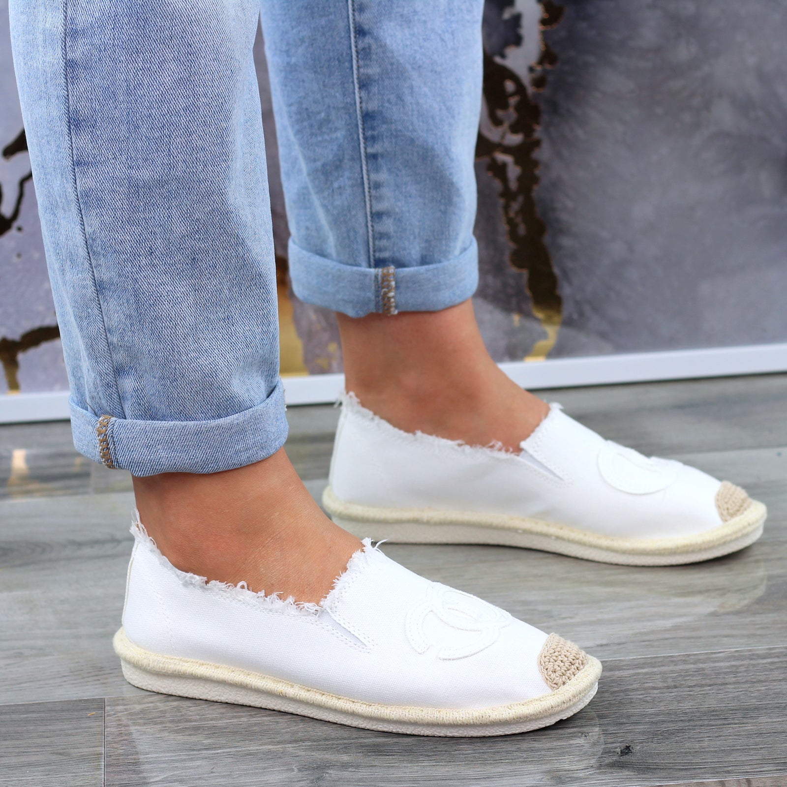 Białe płaskie espadryle damskie z logowaniem