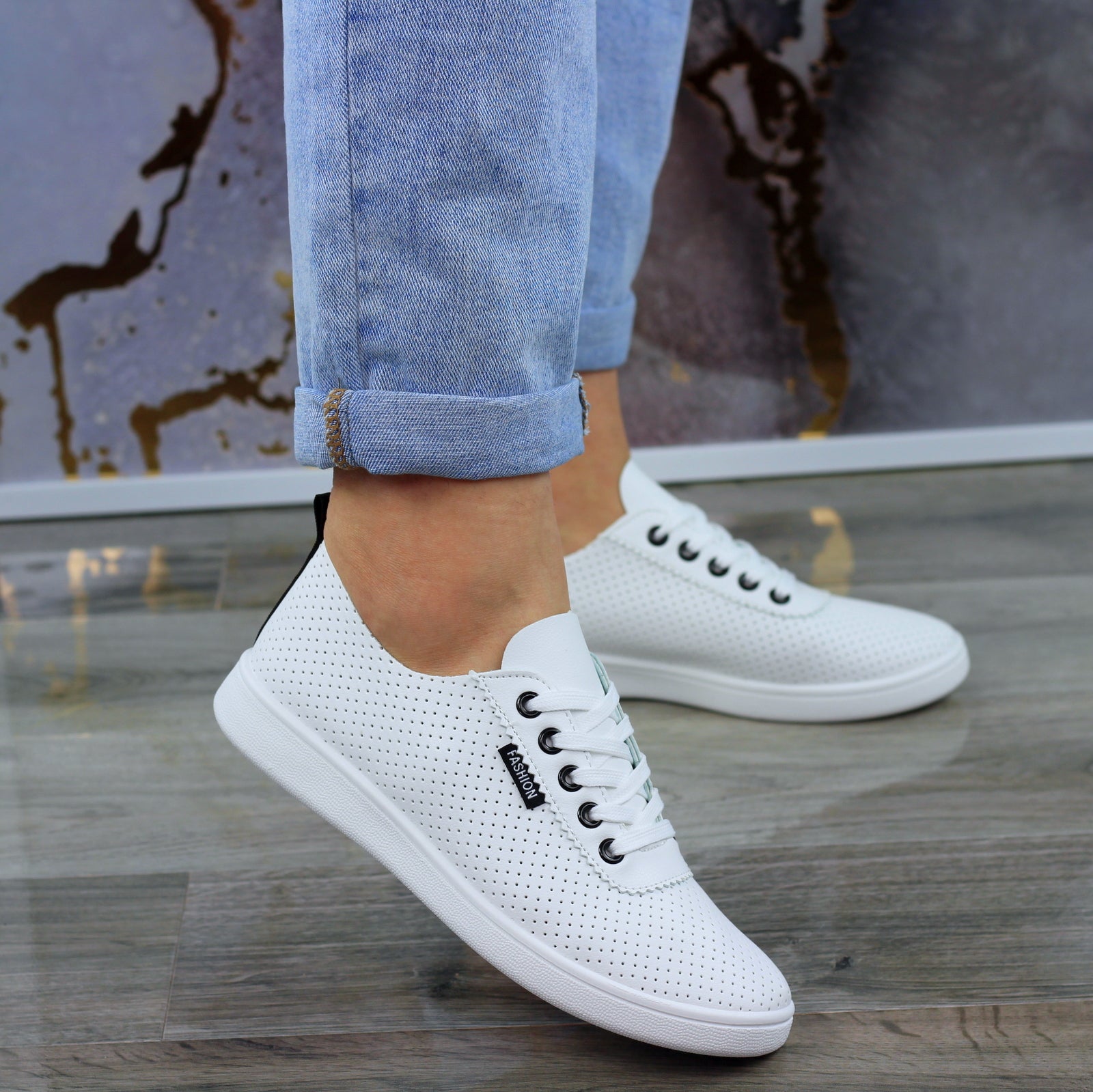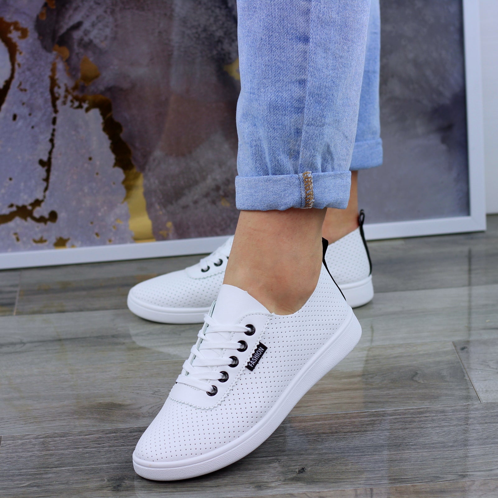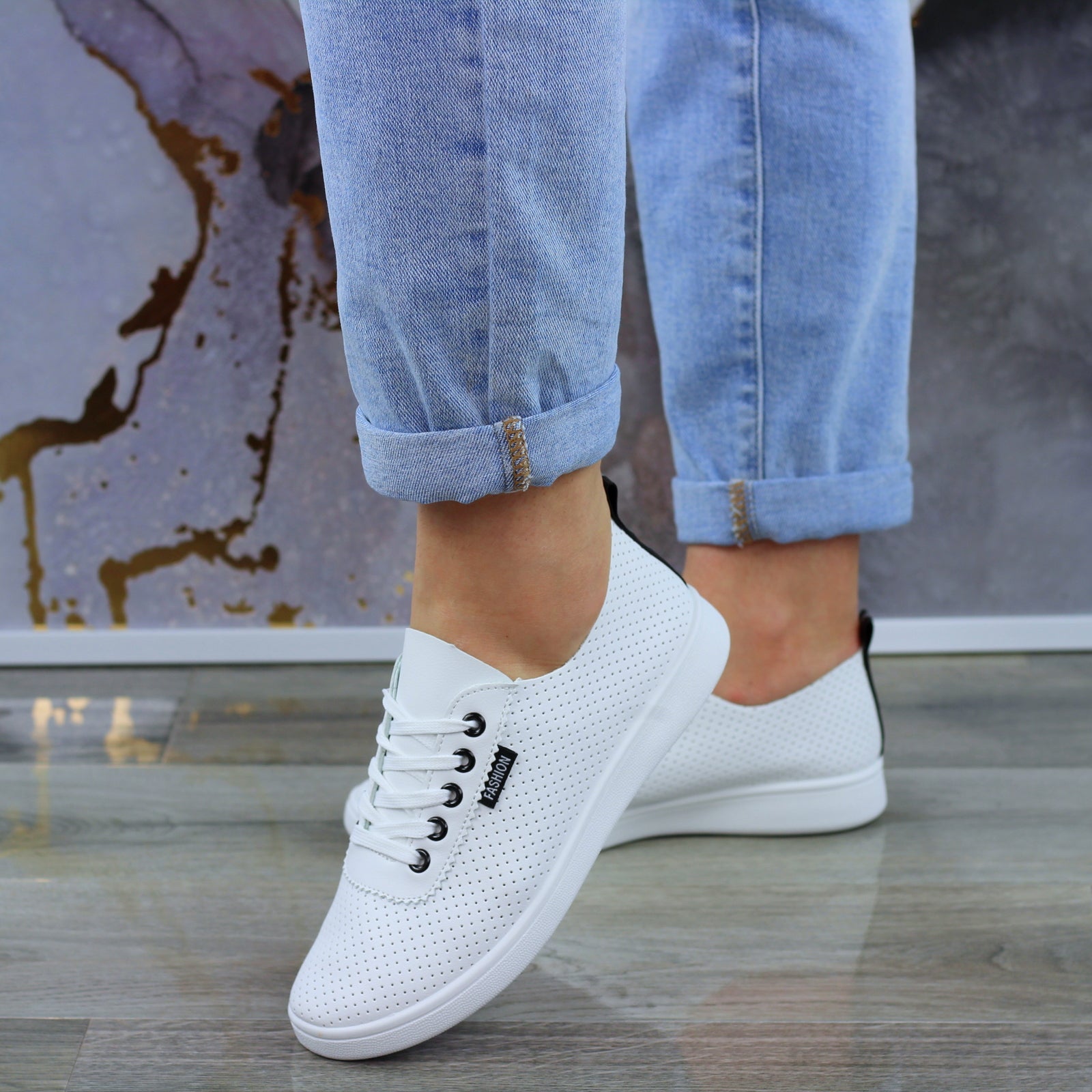 MODNE BIAŁO SKÓRZANE TRAMPKI DAMSKIE DZIURKOWANE FASHIONS
