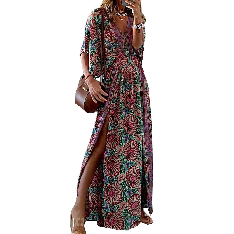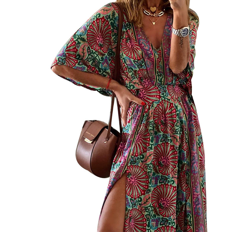 Nowa bohemian średniej długości sukienka z dekoltem w serek i nadrukiem