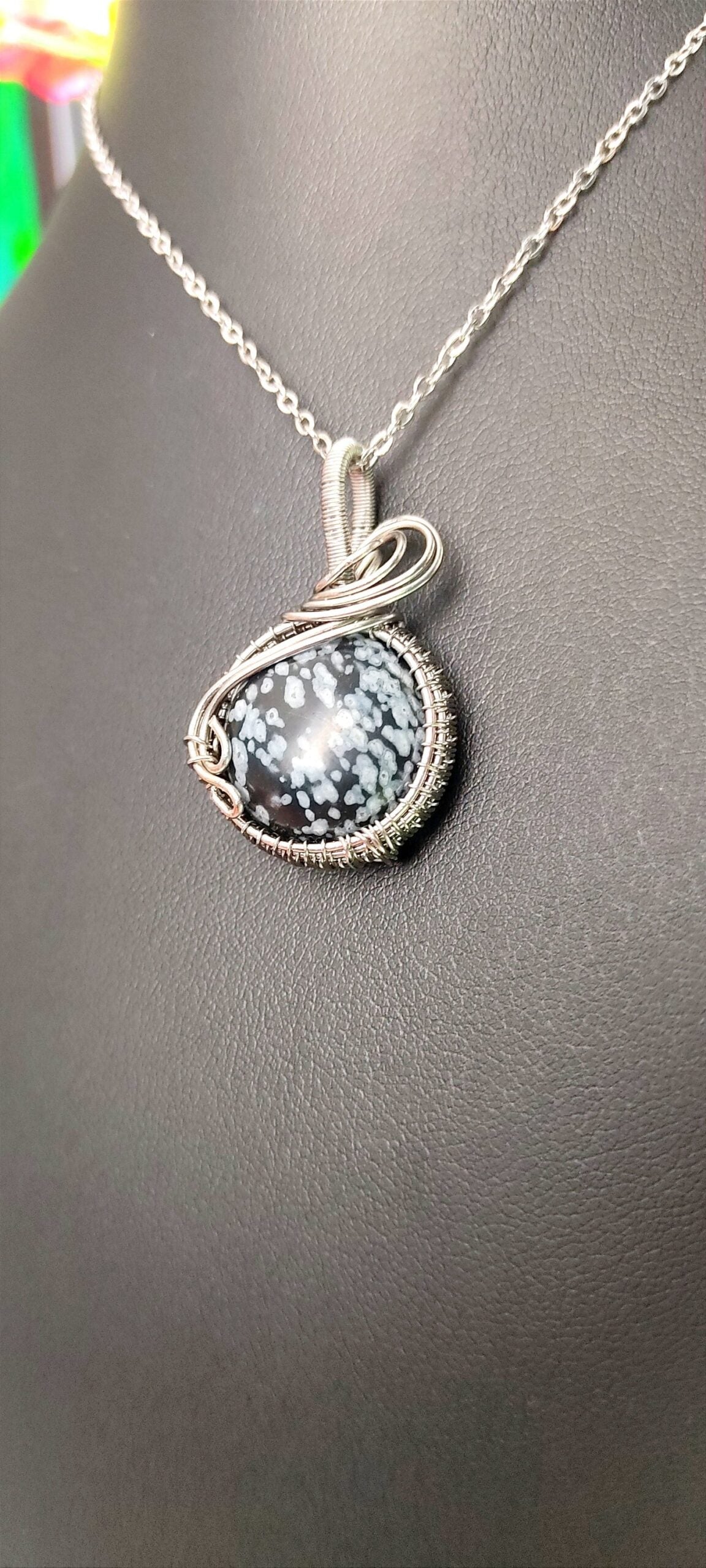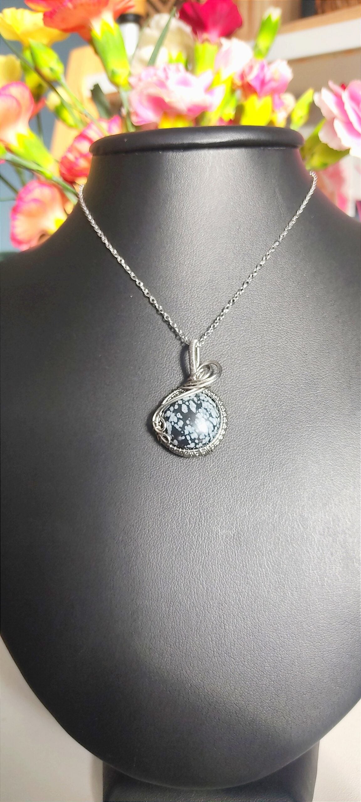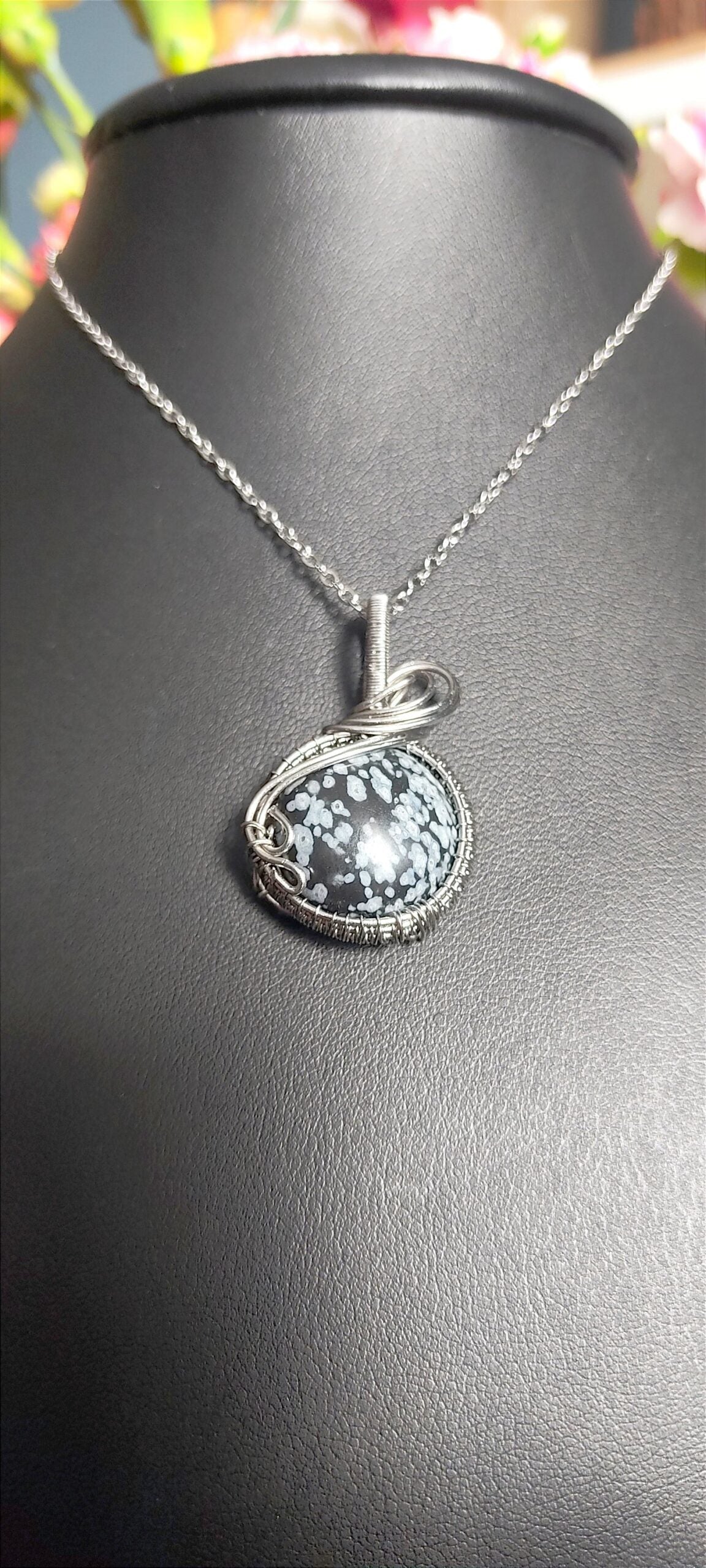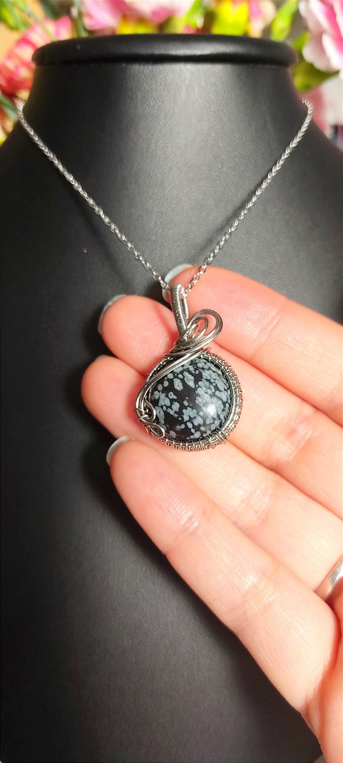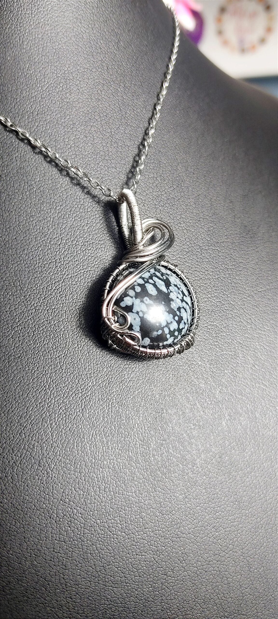 Ręcznie robiony wisiorek z obsydianem śnieżnym. Wykonany techniką wire wrapping z drutów ze stali chirurgicznej.