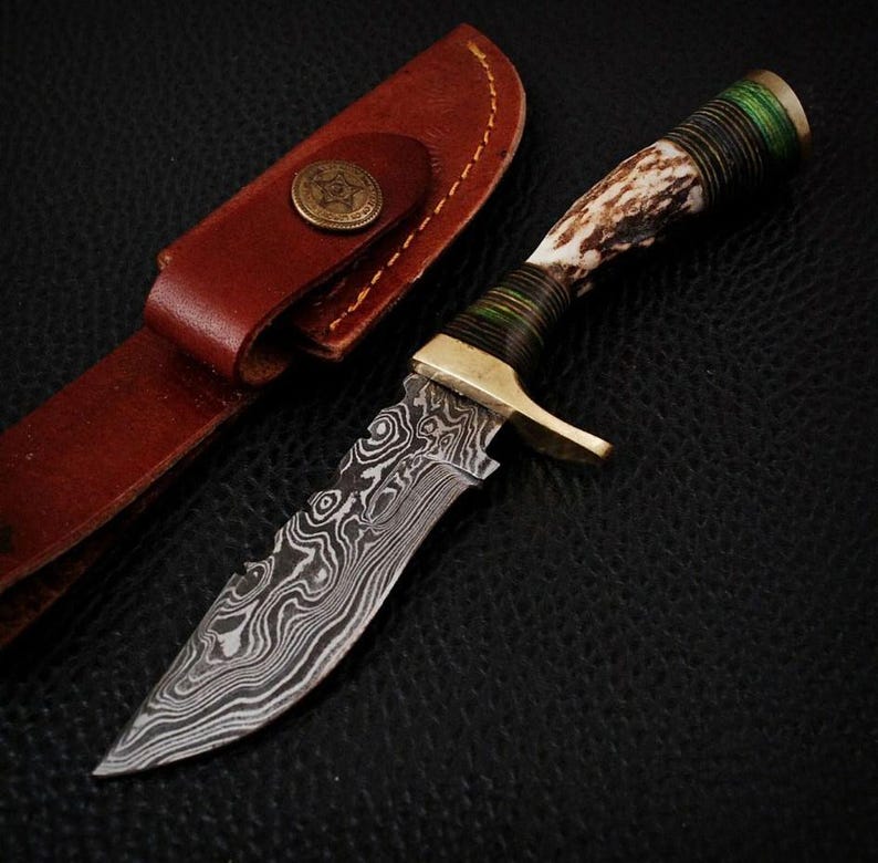 Ręcznie robiony nóż do skórowania ze stali damasceńskiej o długości 15 cm z rękojeścią z poroża