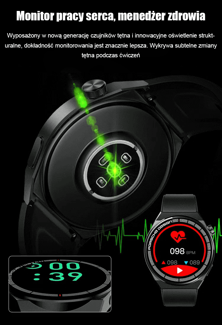 Watch i Porsche Smart Wear to nie tylko zegarek, ale także Twój osobisty kamerdyner, który może dokładnie monitorować poziom cukru we krwi, tętno, ciśnienie krwi, tętno i temperaturę ciała w zaledwie 1 sekundę. Monitoruj przez cały czas, aby chronić swoje zdrowie.